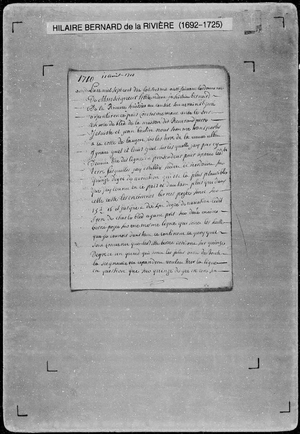 Procès-verbal de vérification de lignes de trois terres suivant une ordonnance de l'intendant de la Nouvelle-France, lesquelles terres étant situées à la côte de Lauzon, seigneurie de Lauzon. La présente pièce concerne directement: la veuve Albert; Ignace Guet (Guay); Louis Guet (Guay) (arpenteurs Hilaire Bernard de Larivière et Charles Deblé), 11 août 1710 - 12 août 1710, Archives nationales à Québec, Fonds Cour supérieure. District judiciaire de Québec. Greffes d'arpenteurs, (03Q,CA301,S56,P341).