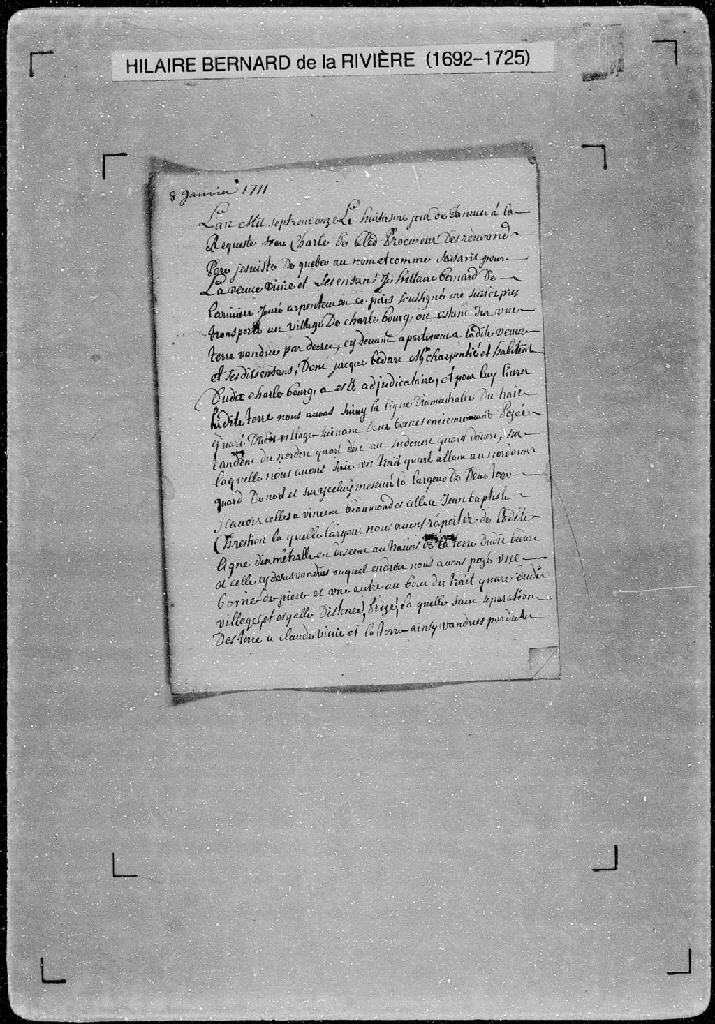 Procès-verbal de ligne et bornes séparant deux terres situées au village de Charlesbourg. La présente pièce concerne directement: Jacques Bedart (Bédard), maître charpentier et habitant de Charlesbourg; Claude Vivie (Vivier) (arpenteur Hilaire Bernard de Larivière), 8 janvier 1711, Archives nationales à Québec, Fonds Cour supérieure. District judiciaire de Québec. Greffes d'arpenteurs, (03Q,CA301,S56,P349).