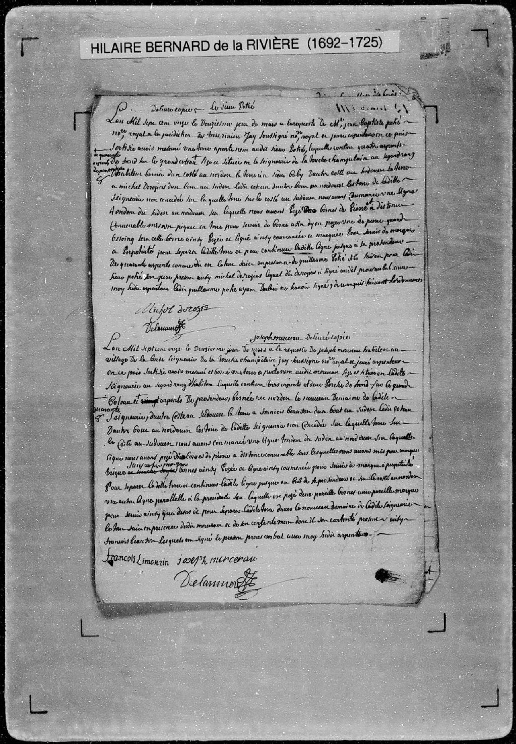 Procès-verbal de ligne et bornes séparant deux terres situées sur le grand coteau, au second rang des habitants de la seigneurie de Latouche-Champlain (Champlain). La présente pièce concerne directement: maître Jean-Baptiste Potié (Pothier), notaire royal à la Juridiction des Trois-Rivières, père de Guillaume Pothier; Michel Deroziers (Desrosiers) (arpenteur Hilaire Bernard de Larivière), 12 mars 1711, Archives nationales à Québec, Fonds Cour supérieure. District judiciaire de Québec. Greffes d'arpenteurs, (03Q,CA301,S56,P367).