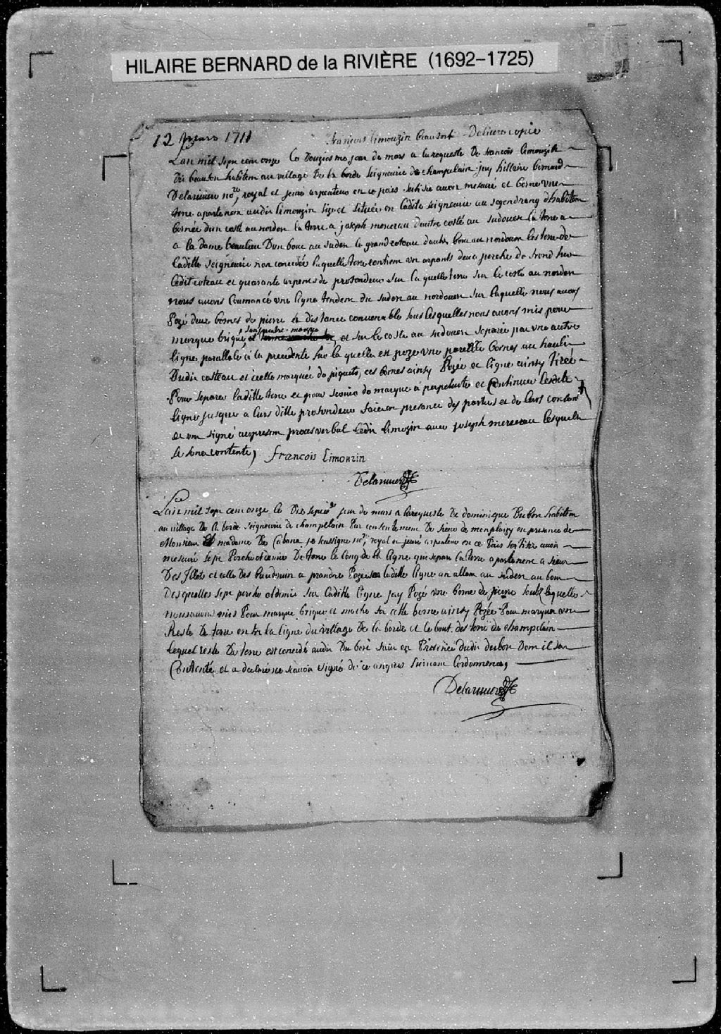 Procès-verbal de lignes et bornes de trois terres situées sur le grand coteau, au village de Laborde, au second rang des habitants de la seigneurie de Champlain. La présente pièce concerne directement: François Limouzin dit Beaufort (Limousin), habitant au village de Laborde, seigneurie de Champlain; Joseph Mercerau (Mercereau); la dame Beaulieu (arpenteur Hilaire Bernard de Larivière), 12 mars 1711, Archives nationales à Québec, Fonds Cour supérieure. District judiciaire de Québec. Greffes d'arpenteurs, (03Q,CA301,S56,P369).