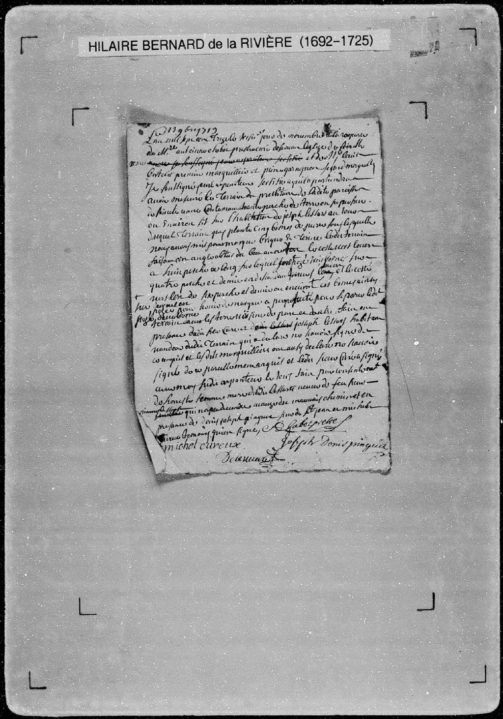 Procès-verbal de mesurage et bornes du terrain du presbytère situé dans la paroisse de Sainte-Anne, [seigneurie de la Côte-de-Beaupré]. La présente pièce concerne directement: le presbytère de la paroisse de Sainte-Anne; Antoine Chabot, prêtre curé desservant l'église de Sainte-Anne; maître Louis Bertelot (Berthelot), premier marguillier [de la paroisse de Sainte-Anne]; Pierre Gaingnon (Gagnon), second marguillier [de la paroisse de Sainte-Anne] (arpenteur Hilaire Bernard de Larivière)