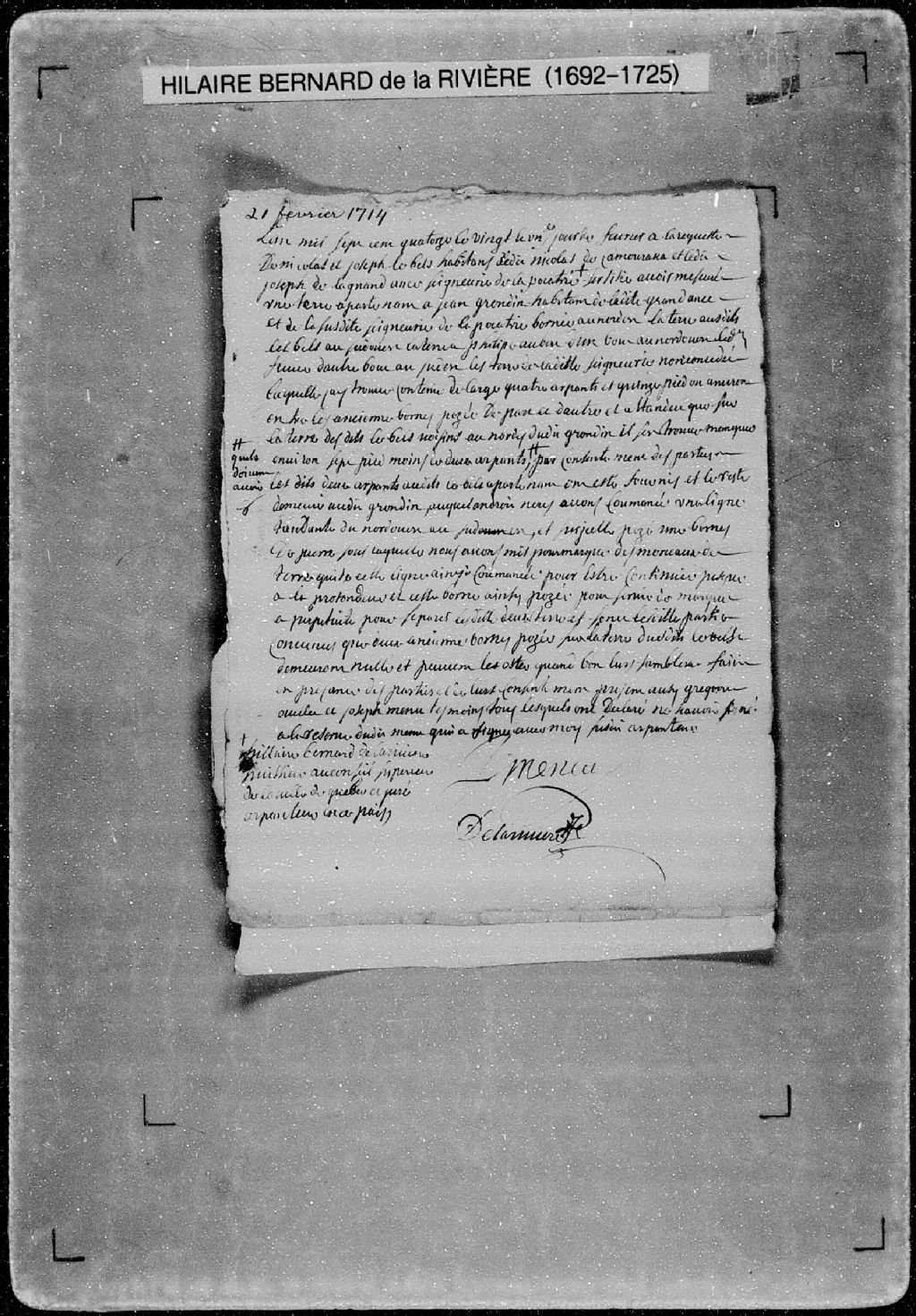 Procès-verbal de cession de terrain et de ligne et borne séparant deux terres situées sur le fleuve Saint-Laurent, à la Grande-Anse, dans la seigneurie de La Pocatière. La présente pièce concerne directement: Jean Grondin, habitant de la Grande-Anse, seigneurie de La Pocatière; Joseph Lebel, habitant de la Grande-Anse, seigneurie de La Pocatière; Nicolas Lebel, habitant de Kamouraska (arpenteur Hilaire Bernard de Larivière), 21 février 1714, Archives nationales à Québec, Fonds Cour supérieure. District judiciaire de Québec. Greffes d'arpenteurs, (03Q,CA301,S56,P419).