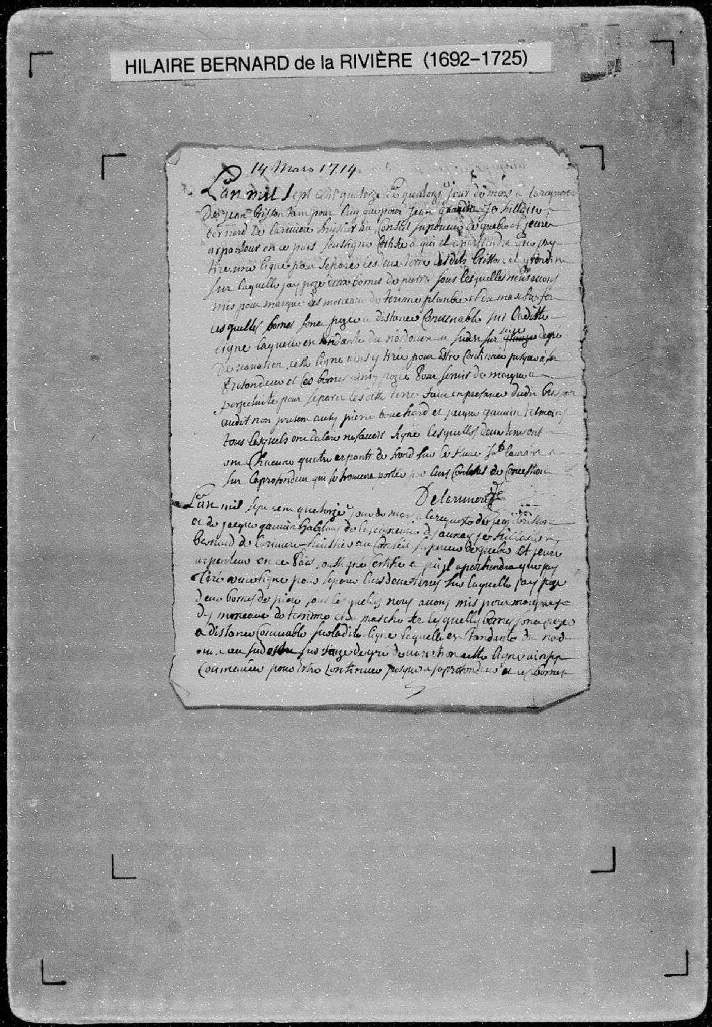 Procès-verbal de ligne et bornes séparant deux terres situées sur le fleuve Saint-Laurent, dans la [seigneurie de Saint-Roch-des-Aulnaies] [seigneurie de la Grande-Anse]. La présente pièce concerne directement: Jean Brisson; Jean Grondin (arpenteur Hilaire Bernard de Larivière), 14 mars 1714, Archives nationales à Québec, Fonds Cour supérieure. District judiciaire de Québec. Greffes d'arpenteurs, (03Q,CA301,S56,P426).