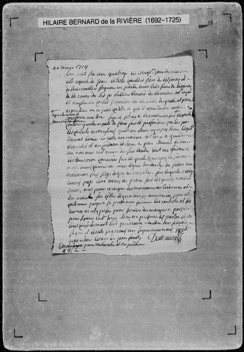 Procès-verbal de ligne et bornes séparant deux terres situées sur la rivière du Sud, dans la seigneurie de la Rivière-du-Sud. La présente pièce concerne directement: François Jandrau (Gendreau); Jean Fournier (arpenteur Hilaire Bernard de Larivière), 20 mars 1714, Archives nationales à Québec, Fonds Cour supérieure. District judiciaire de Québec. Greffes d'arpenteurs, (03Q,CA301,S56,P428).