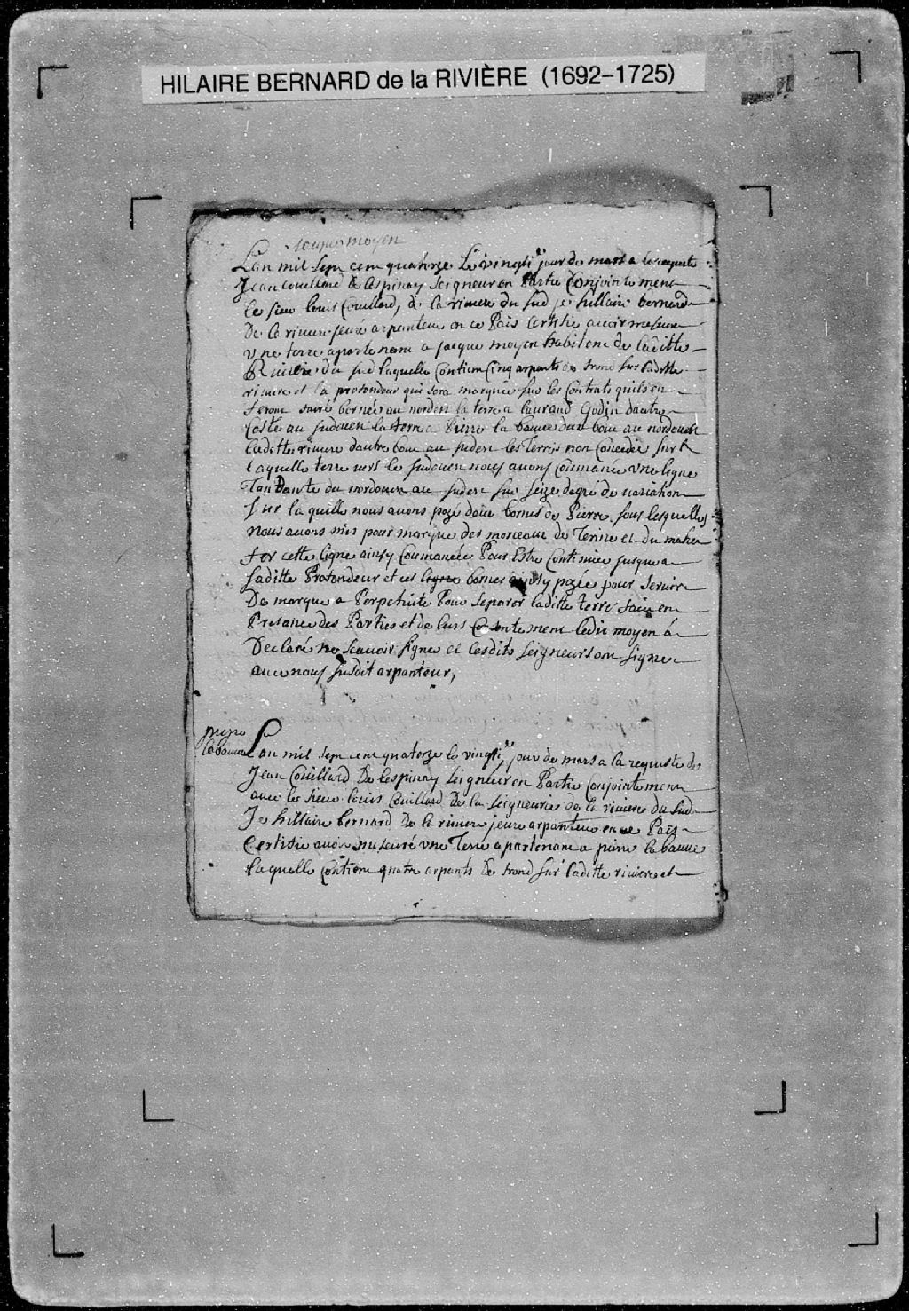 Procès-verbal de ligne et bornes séparant deux terres situées sur la rivière du Sud, dans la seigneurie de la Rivière-du-Sud. La présente pièce concerne directement: Pierre Labauve; Pierre Pelerin (Pellerin) (arpenteur Hilaire Bernard de Larivière), 20 mars 1714, Archives nationales à Québec, Fonds Cour supérieure. District judiciaire de Québec. Greffes d'arpenteurs, (03Q,CA301,S56,P434).
