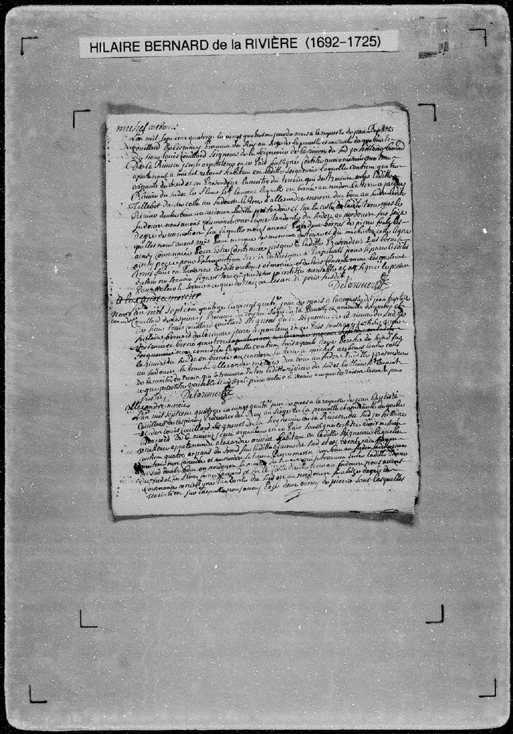 Procès-verbal de chaînage d'une terre non concédée, laquelle terre étant située sur la rivière du Sud, dans la seigneurie de la Rivière-du-Sud (arpenteur Hilaire Bernard de Larivière), 24 mars 1714, Archives nationales à Québec, Fonds Cour supérieure. District judiciaire de Québec. Greffes d'arpenteurs, (03Q,CA301,S56,P450).