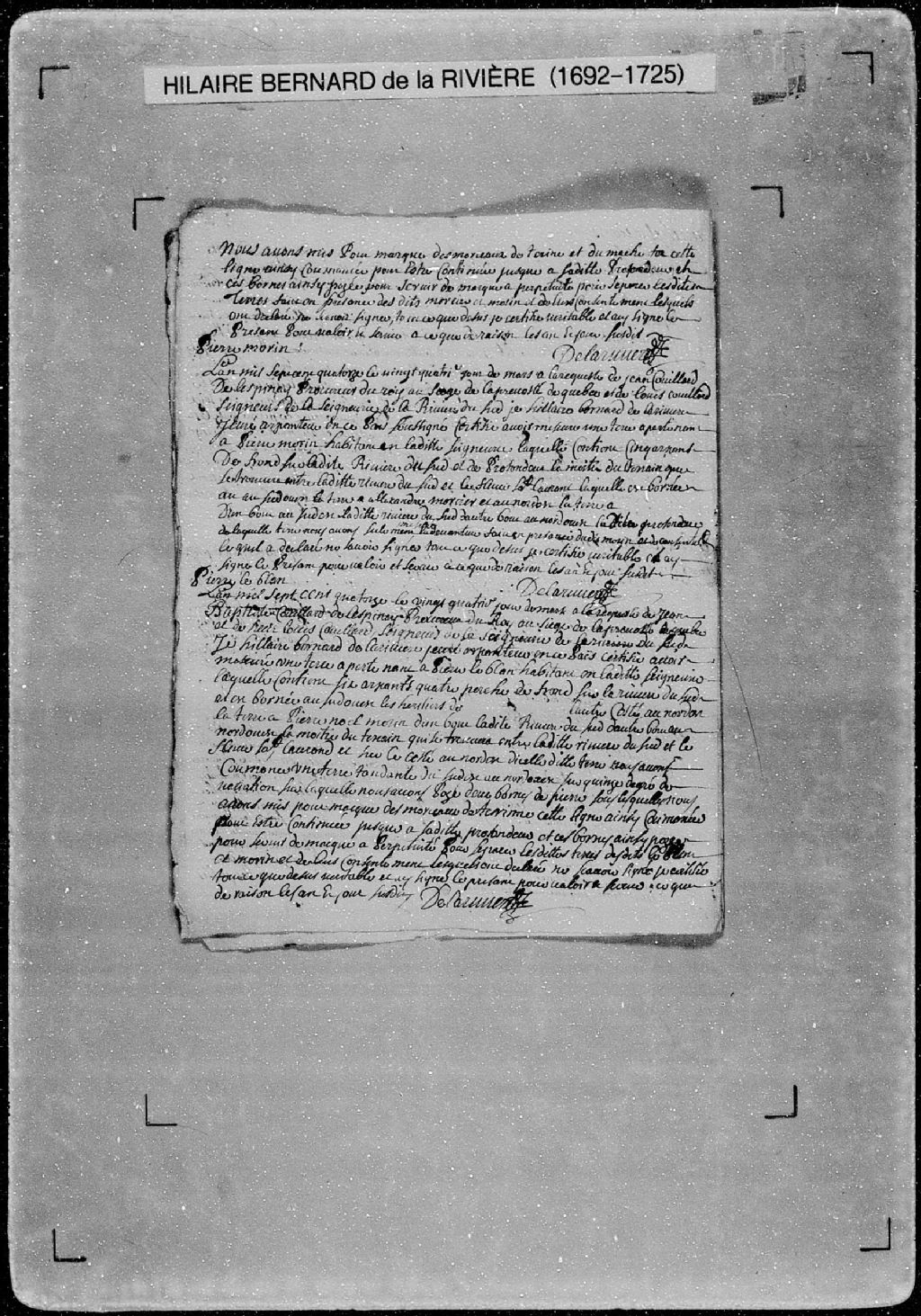 Procès-verbal de ligne et bornes séparant deux terres situées sur la rivière du Sud, dans la seigneurie de la Rivière-du-Sud. La présente pièce concerne directement: Pierre Leblan (Leblanc), habitant en la seigneurie de la Rivière-du-Sud; Pierre-Noël Morin (arpenteur Hilaire Bernard de Larivière), 24 mars 1714, Archives nationales à Québec, Fonds Cour supérieure. District judiciaire de Québec. Greffes d'arpenteurs, (03Q,CA301,S56,P453).