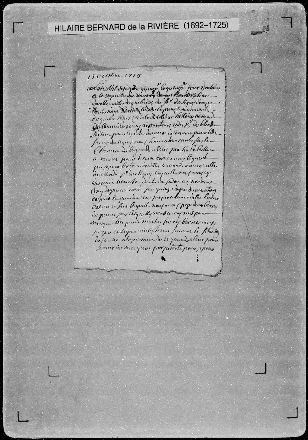Procès-verbal de ligne et bornes séparant deux terres situées près de la butte à Neveu, depuis la Grande Allée jusqu'à l'anse dite l'anse des Mères, sur le chemin de la Grande Allée. La présente pièce concerne directement: les Révérendes Dames Mères Ursulines de la ville de Québec; le sieur Dartigny (d'Artigny), écuyer, lieutenant particulier de la Prévôté et Amirauté de Québec (arpenteurs Hilaire Bernard de Larivière et Charles Deblé), 15 octobre 1715, Archives nationales à Québec, Fonds Cour supérieure. District judiciaire de Québec. Greffes d'arpenteurs, (03Q,CA301,S56,P473).