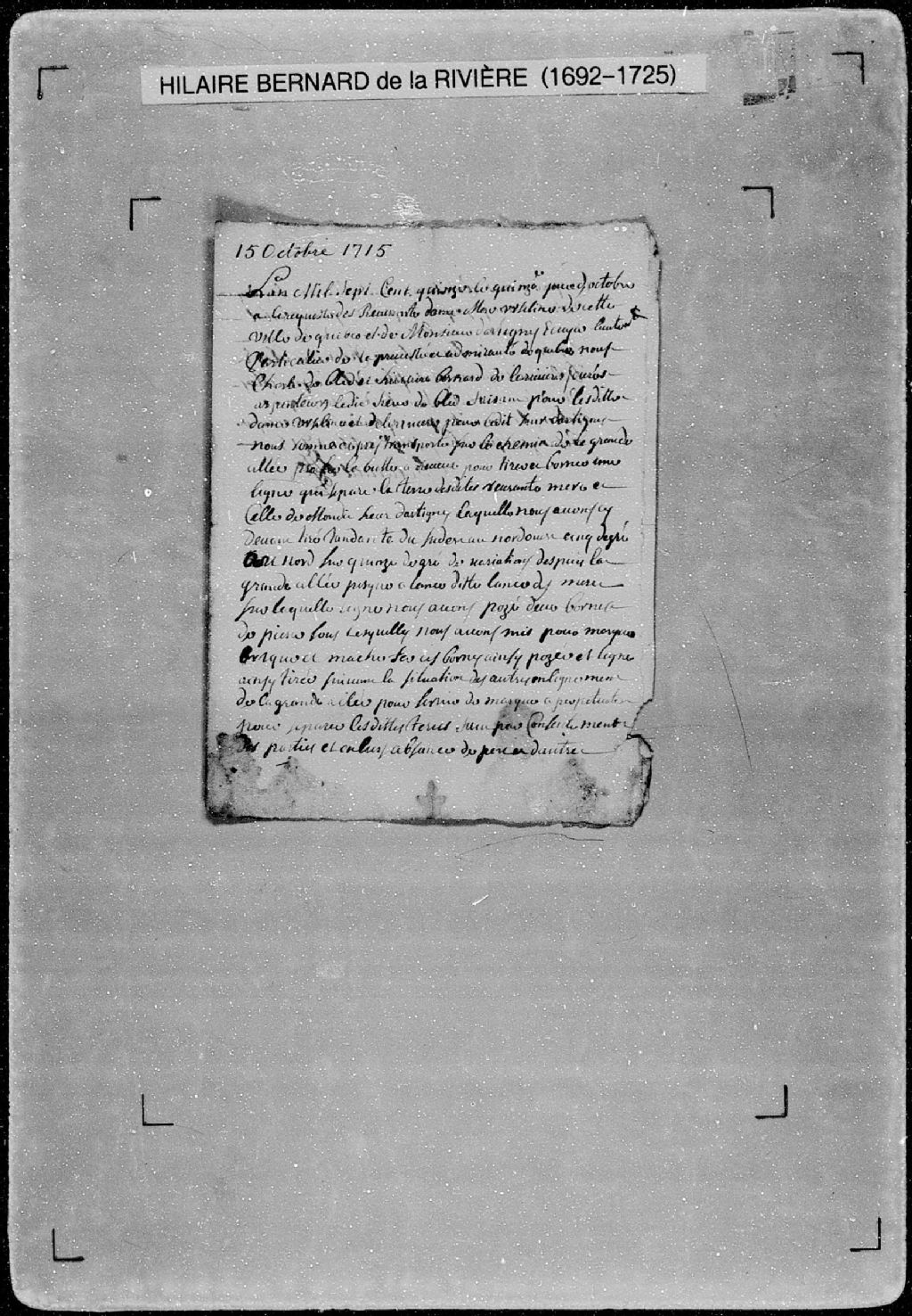 Procès-verbal de ligne et bornes séparant deux terres situées près de la butte à Neveu, depuis la Grande Allée jusqu'à l'anse dite l'anse des Mères, sur le chemin de la Grande Allée. La présente pièce concerne directement: les Révérendes Dames Mères Ursulines de la ville de Québec; le sieur Dartigny (d'Artigny), écuyer, lieutenant particulier de la Prévôté et Amirauté de Québec (arpenteurs Hilaire Bernard de Larivière et Charles Deblé), 15 octobre 1715, Archives nationales à Québec, Fonds Cour supérieure. District judiciaire de Québec. Greffes d'arpenteurs, (03Q,CA301,S56,P474).