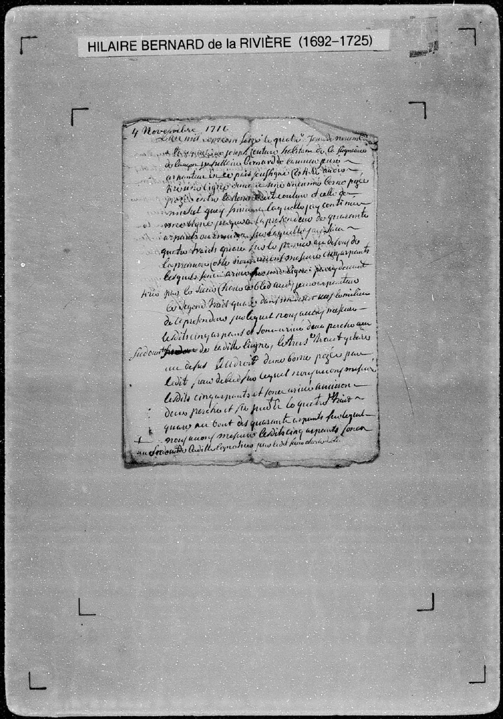 Procès-verbal de ligne et bornes séparant deux terres situées dans la seigneurie de Lauzon. La présente pièce concerne directement: Joseph Couture, habitant de la seigneurie de Lauzon; Michel Guay (arpenteur Hilaire Bernard de Larivière), 4 novembre 1716 - 5 novembre 1716, Archives nationales à Québec, Fonds Cour supérieure. District judiciaire de Québec. Greffes d'arpenteurs, (03Q,CA301,S56,P479).