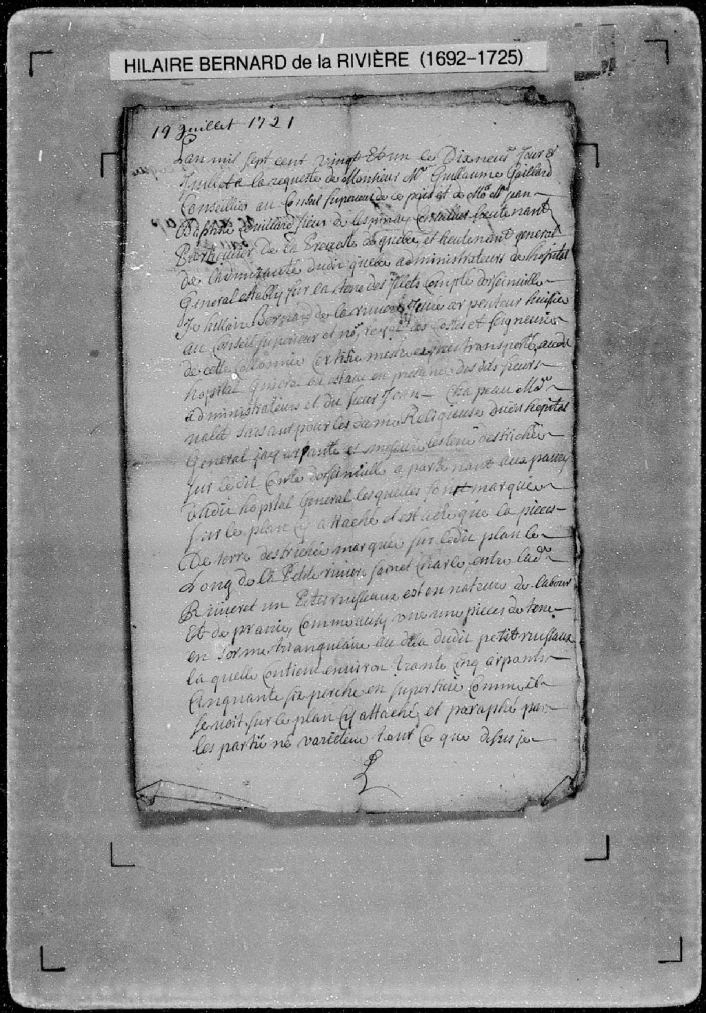 Procès-verbal de chaînage de terres défrichées situées le long de la petite rivière Saint-Charles dans le comté d'Orsainville. La présente pièce concerne directement: l'Hôpital général; les pauvres de l'Hôpital général (arpenteur Hilaire Bernard de Larivière), 19 juillet 1721, Archives nationales à Québec, Fonds Cour supérieure. District judiciaire de Québec. Greffes d'arpenteurs, (03Q,CA301,S56,P519).
