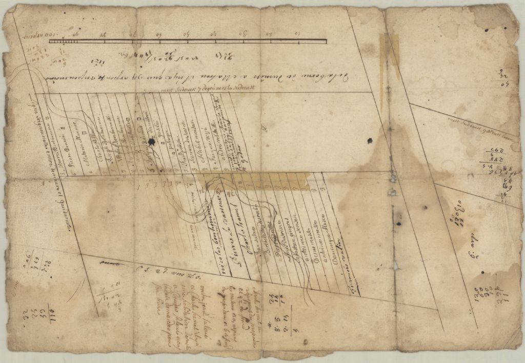 Plan d'arpentage de la seigneurie de Maur et de chaînage et lignes de deux rangs des terres la composant à partir de la ligne seigneuriale entre de Maur et Gaudarville.