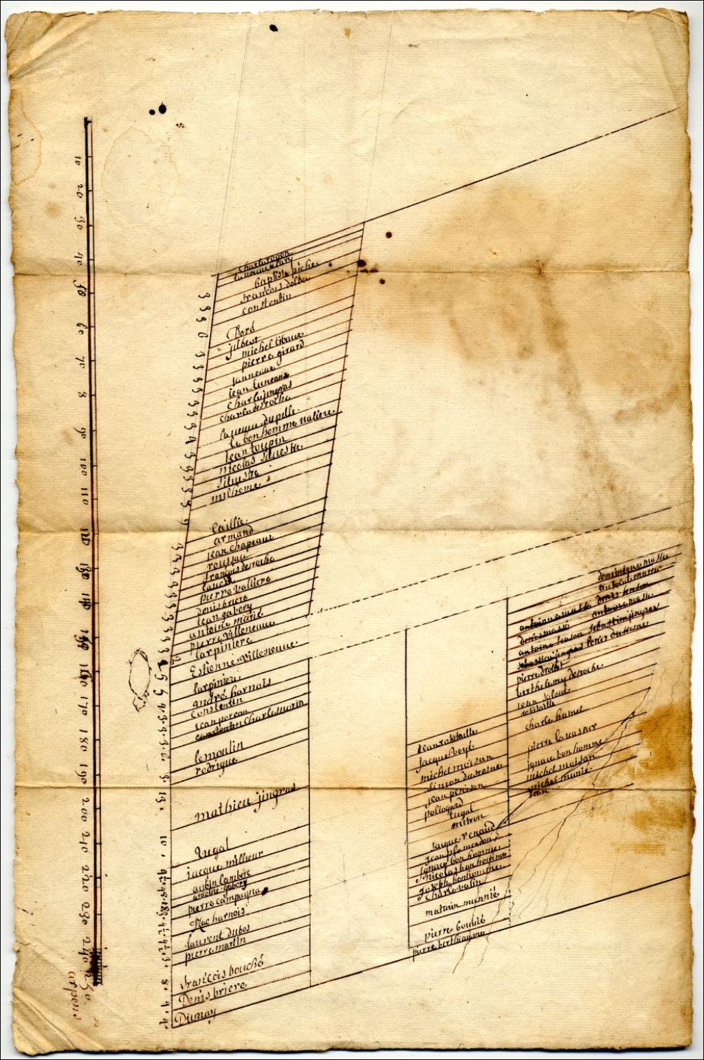 La pièce se compose du plan d'arpentage de la [seigneurie de Maur] et lignes de trois rangs des terres la composant. Elle concerne directement: Charles Rogon (Rognon); la veuve Alary (Alarie); Baptiste Piché; François Dolbec; le nommé Constentin (Constantin); le nommé Doré; le nommé Jilbert (Gilbert, Gillebert); Michel Tibaux (Thibault); Pierre Girard; le nommé Janneaux (Janneau, Janot); Jean Luneaux (Luneau, Louineau); Charles Jingras (Gingras); Charles Desroche (Desroches); la veuve Dupille (Dupil); le nommé Valiere (Vallière); Jean Toupin; Nicolas Silvestre (Sylvestre); le nommé Silvestre (Sylvestre); le nommé Milhomme; le nommé Caillie (Caillé); le nommé Armand; Jean Chapeaux (Chapeau); le nommé Roussau (Rousseau); François Desroche (Desroches); le nommé Lavoie; Pierre Vallière; Denis Brière; Jean Gabory (Gaboury); Antoine Marié (LeMarié); Pierre Villeneuve; le nommé Larpinière; Étienne Villeneuve; André Harnois; Jean Poreau (Porreau); Charles Morin; le moulin; le nommé Rodrigue; Mathieu Jingras (Gingras); le nommé Dugal; Pierre Campagna; Isaac Harnois; Laurent Dubos (Duboc, Dubeau); Pierre Martin; François Bouché (Boucher); le nommé Dumay (Dumais, Dumets, Demers); Jean Robitaille; Jacques Boyé (Voyer, Boyer); Michel Moisan; Simon Dufresne; Jean Penison (Pénisson); Polycarpe Ogard (Augeard); le nommé Tugal (Dugal); le nommé Mitron (Nitron); Jacques Renaud; Jean Plamondon; Ignace Bonhomme; Nicolas Bonhomme; Joseph Bonhomme; Charles Valin; Mathurin Munnié (Meunier); Pierre Bouvié (Bouvier); Pierre Berthiaume; Dominique Masse; Antoine Masse; Denis Senson (Samson); Antoine Masse; Sébastien Jingras (Gingras); Louis Dufresne; Pierre Drollet (Drolet); Barthélemi Desroche (Desroches); Jean Saloué (Salois); le nommé Robitaille; Charles Hamel; Pierre Levaseur (Levasseur); Michel Munié (Meunier); le nommé Jean.