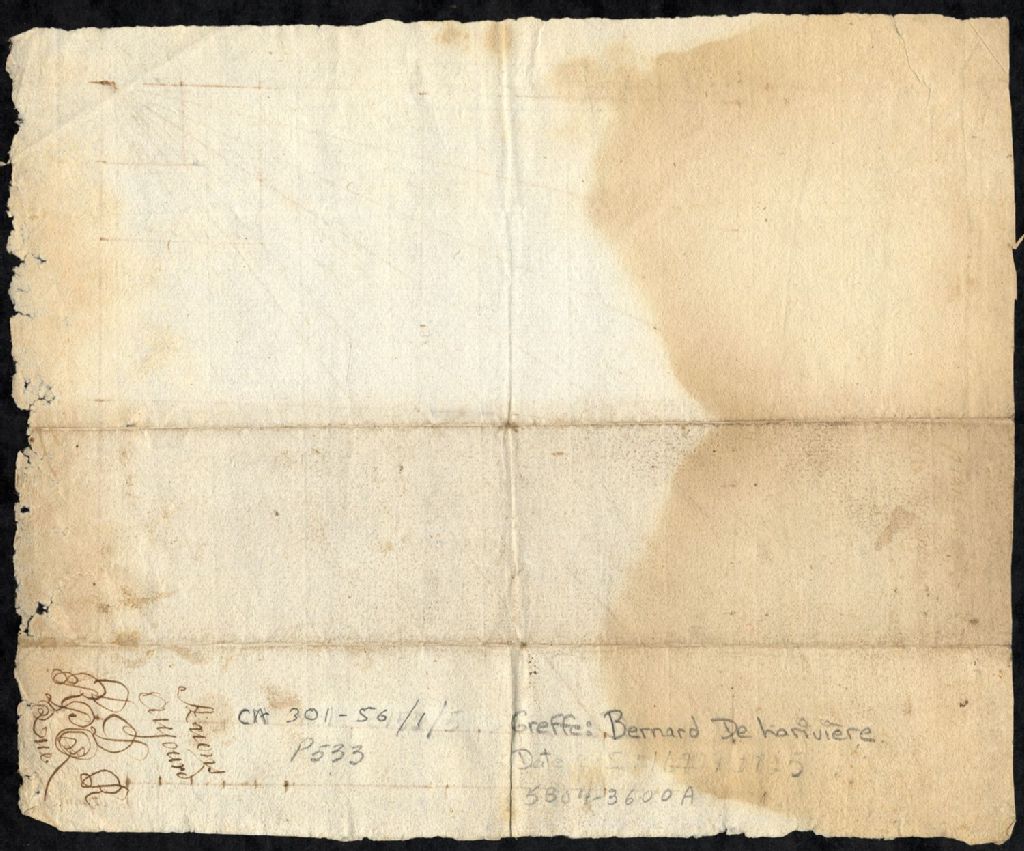 Plan d'arpentage et de chaînage de trois terres situées au [village de Laborde], [seigneurie de Latouche-Champlain (Champlain)]. La présente pièce concerne directement: [Dominique] Dubort (Dubord); [Pierre] Mercereau; le nommé Dufort (Dubord, Beaufort) (arpenteur Hilaire Bernard de Larivière)