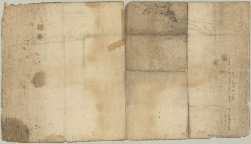 - La pièce se compose du plan d'arpentage des deux premiers rangs de la seigneurie de Tilly, sur le fleuve Saint-Laurent, jusqu'à la rivière Tahouet. Elle concerne directement: le sieur Le Gardeur (LeGardeur); Benoît Boucher, de la première concession; le sieur de Vilieu (Villieu), de la première concession; Joseph Saint-Laurent, de la première concession; François Boucher, de la première concession; Pierre Lembert (Lambert), de la première concession; Jean de Lavoy (Lavoye, Lavoie), de la première concession; René Dumay (Dumais, Dumets, Demers), de la première concession; Adrien Ayot (Ayotte, Hayot), de la première concession; Louis Ayot (Ayotte, Hayot), de la première concession; Louis Croteaux (Croteau), de la première concession; Rémi Valière (Vallière), de la première concession; Charles Croteau, de la première concession; Nicolas Croteaux (Croteau), de la première concession; Guillaume Rognon, de la première concession; Claude Garnie (Garnier, Grenier), de la première concession; Michel de Serre (DeSerre), de la première concession; le nommé Laramé (Laramée), de la première concession; Gilles Dufaux (Dufault), de la première concession; Baptiste Bisson, de la première concession; Charles Rognon, de la première concession; Charles Rousseau, de la première concession; André Bergeron, de la première concession; Pierre Bergeron, de la première concession; Étienne Langlois, de la seconde concession; Jean Langlois, de la seconde concession; Pierre Brouseau (Brousseau, Brosseau), de la seconde concession; Jacques Hupé (Huppé), de la seconde concession; Antoine Martel, de la seconde concession; Jean Martel, de la seconde concession; Jean Gervais, de la seconde concession; Jacques Gervais, de la seconde concession; Louis Langevin, de la seconde concession; Nicolas Brouseaux (Brousseau, Brosseau), de la seconde concession; Jacques Pasquet (Paquet), de la seconde concession; Louis Pasquet (Paquet), de la seconde concession; Claude Vendendaigue (Vandandaigue), de la seconde concession; Paul Langlois, de la seconde concession; le nommé Lambert, de la seconde concession; le nommé François, de la seconde concession; le nommé Rodrigue, de la seconde concession; Vincent Guillot, de la seconde concession; Charles Normand, de la seconde concession; le nommé Lacroix, de la seconde concession; le nommé Rotot, de la seconde concession; le nommé Hayot (Ayot, Ayotte), de la seconde concession; Charles Crotaux (Croteau), de la seconde concession; le nommé Demers, de la seconde concession