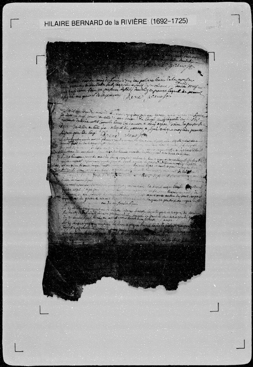 Procès-verbal de borne séparant deux terres situées dans la [seigneurie de Varennes]. La présente pièce concerne directement: le sieur de la Gemeray (La Jemmerais, LaJemmerais); [René] Daudelin (arpenteur Hilaire Bernard de Larivière), 6 février 1704, Archives nationales à Québec, Fonds Cour supérieure. District judiciaire de Québec. Greffes d'arpenteurs, (03Q,CA301,S56,P61).