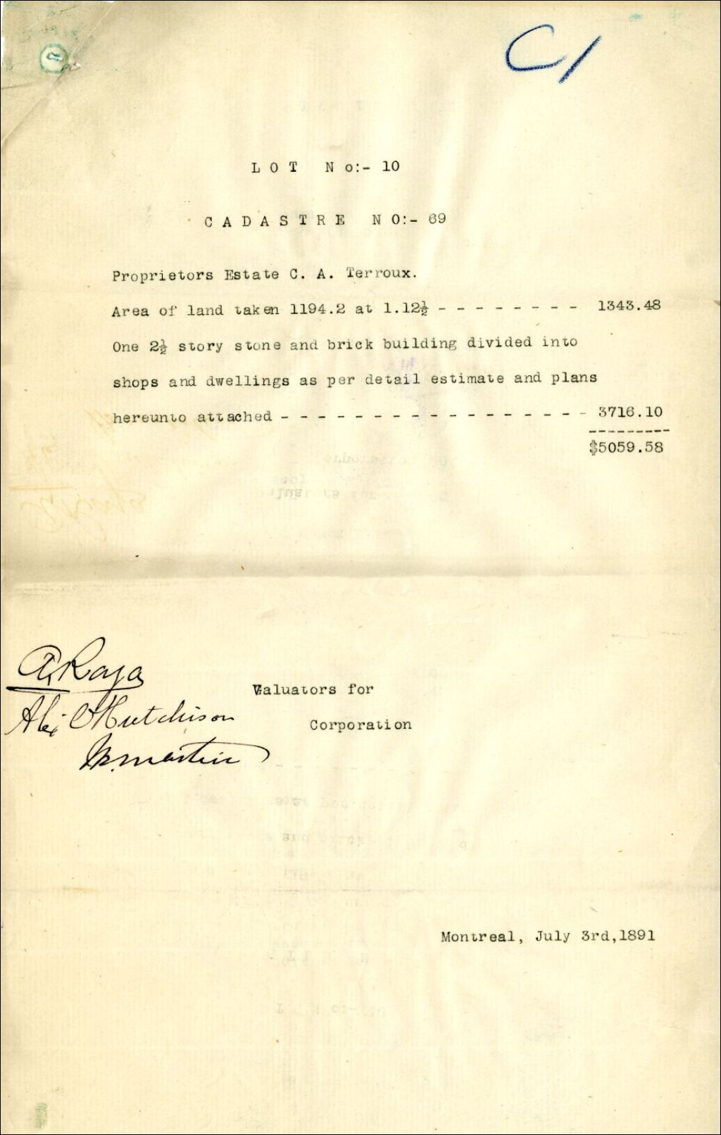 - L'expropriation concerne la succession Charles A. Terroux. Le dossier comprend le devis et les dessins (échelle indéterminée et 8 pieds au pouce) incluant les coupes et les élévations du bâtiment. Les évaluateurs nommés au dossier sont Alphonse Raza, Alexandre Hutchison, J. B.? Martin