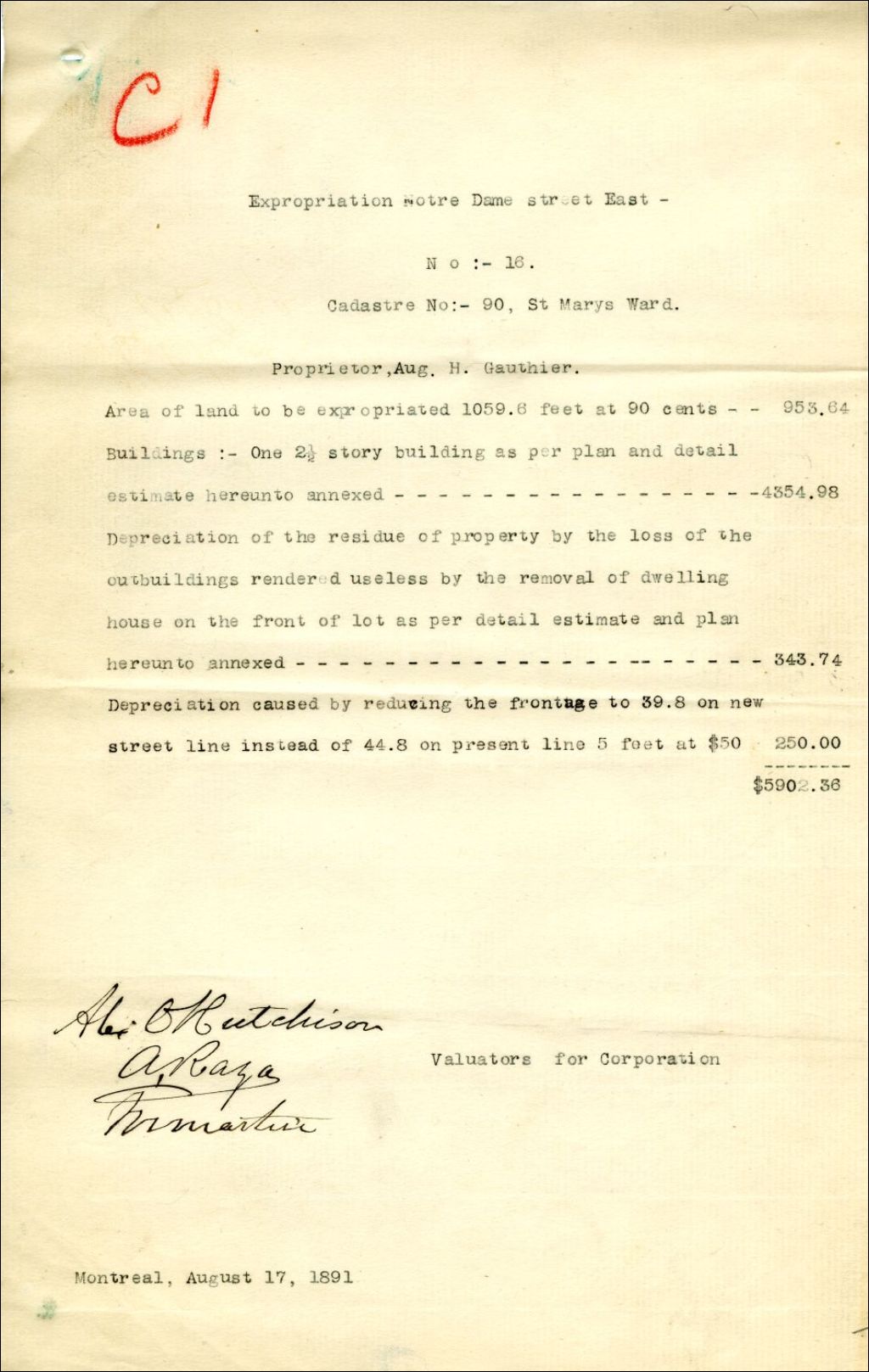 Expropriation de la maison d'Auguste H. Gauthier, lot 16 du cadastre 90; rue Notre-Dame, quartier Sainte-Marie, ville de Montréal