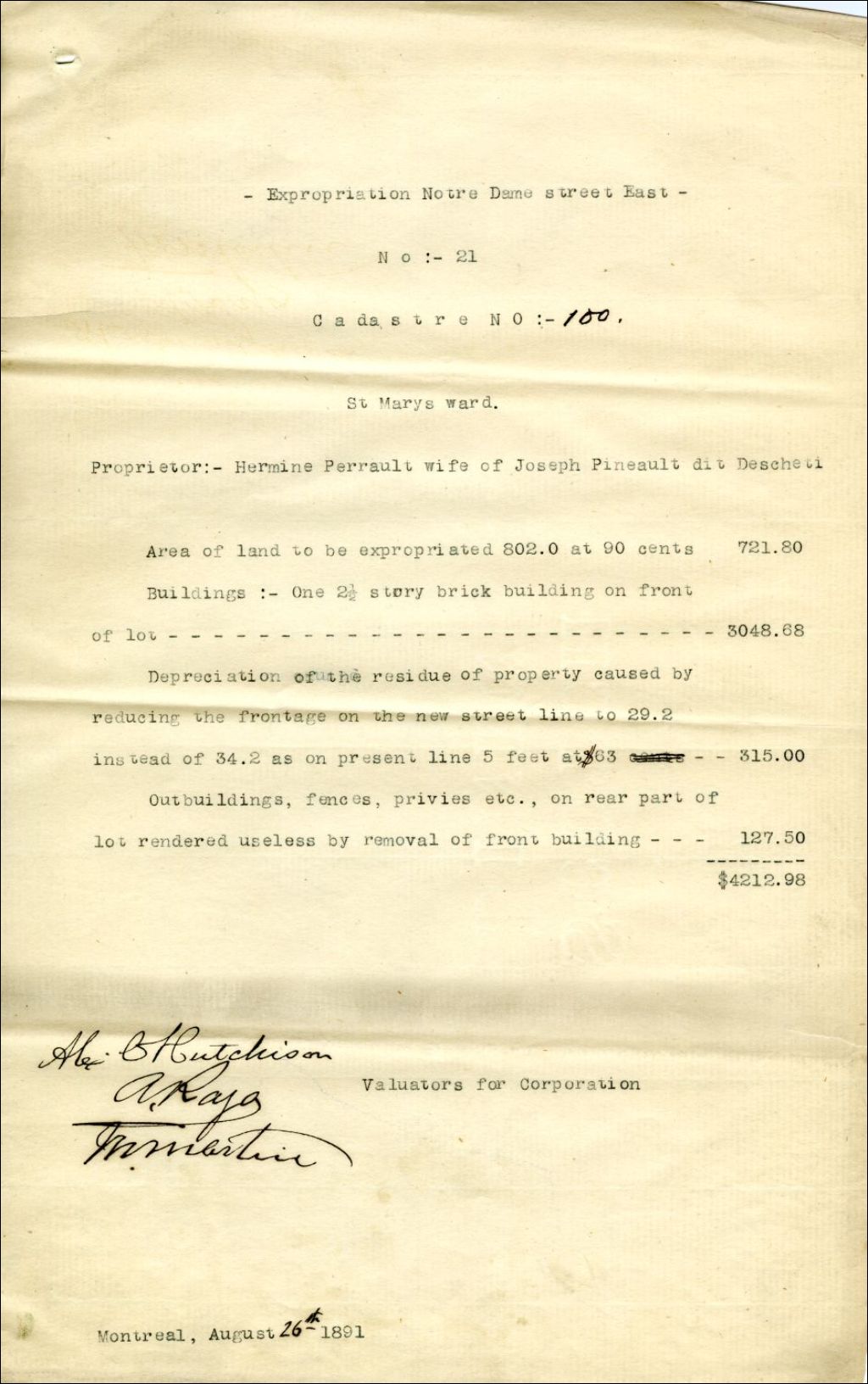 - Expropriation sur la rue Notre-Dame, quartier Sainte-Marie à Montréal. Maison d'Hermine Perreault, épouse de Joseph Pineault dit Descheti, située sur le lot 21 du cadastre 100