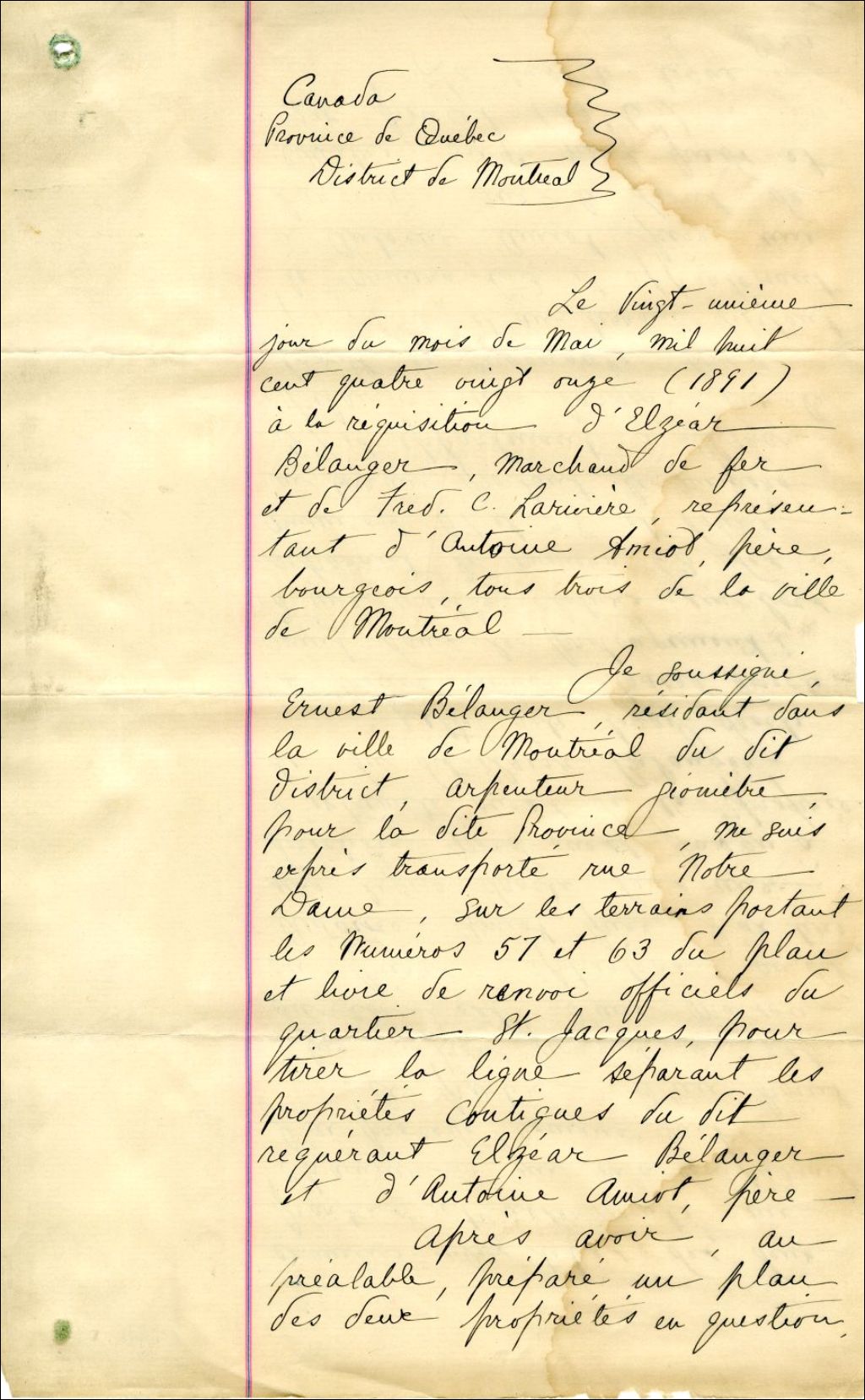 - Il s'agit du procès-verbal d'une ligne de division entre les propriétés d'Antoine Amiot et d'Elzéar Bélanger. L'arpenteur-géomètre, Ernest Bélanger a été désigné au dossier