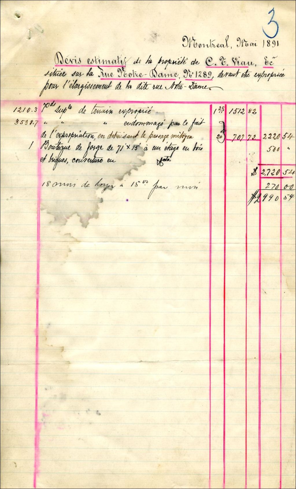 Expropriation sur la rue Notre-Dame Est à Montréal. Propriété de Charles Théodore Viau