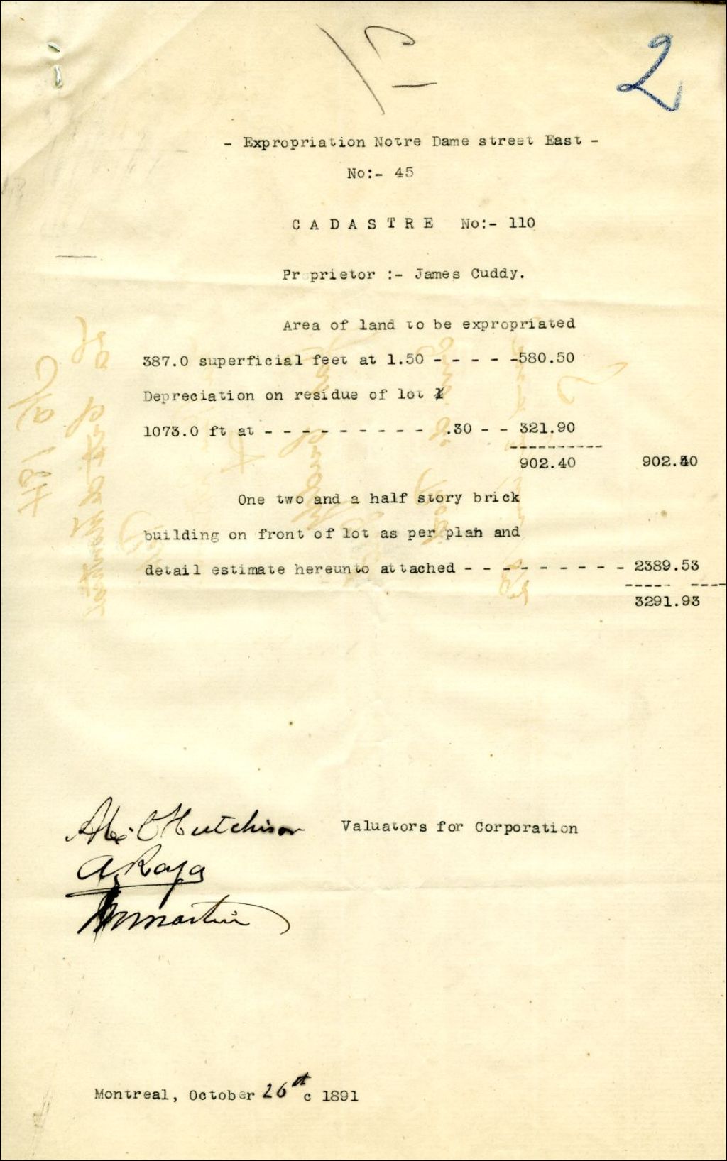 - Expropriation sur la rue Notre-Dame Est à Montréal. Propriété de James Cuddy, lot 45 du cadastre 110
