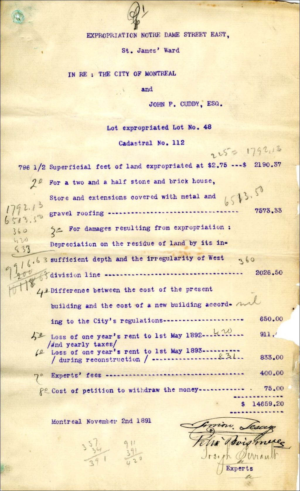 Expropriation de la maison de John P. Cuddy, lot 48 du cadastre 112, rue Notre-Dame Est, quartier Saint-Jacques à Montréal
