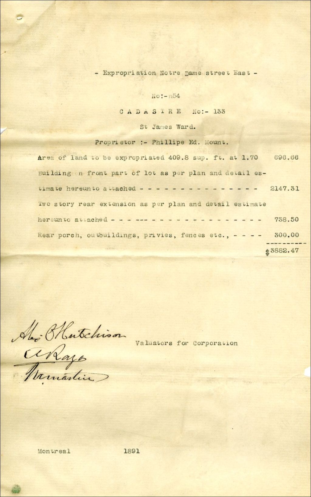 - Expropriation de la maison du docteur Philippe Édouard Mount, lot 54 du cadastre 133, rue Notre-Dame, quartier Saint-Jacques à Montréal