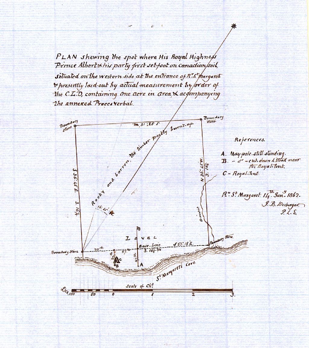 Plan shewing the spot where His Royal Highness Prince Albert and his party first set-foot on canadian soil, situated on the western side at the entrance of Rivière St.Margaret (...)