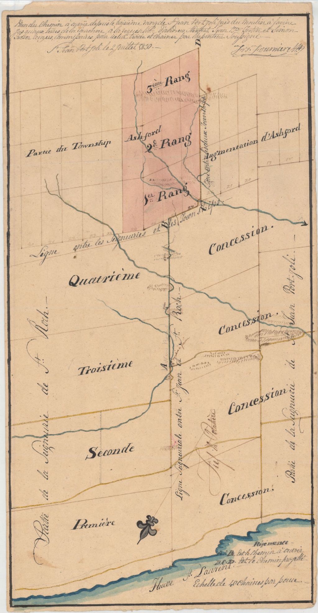 Plan du chemin à ouvrir depuis le 3ème rang de St-Jean-Port-Joli près du moulin à farine jusqu'aux terres de la Couronne à la requête d'Andrew Stuart, Jean-Baptiste Fortin et Simon Fraser, commissaires.