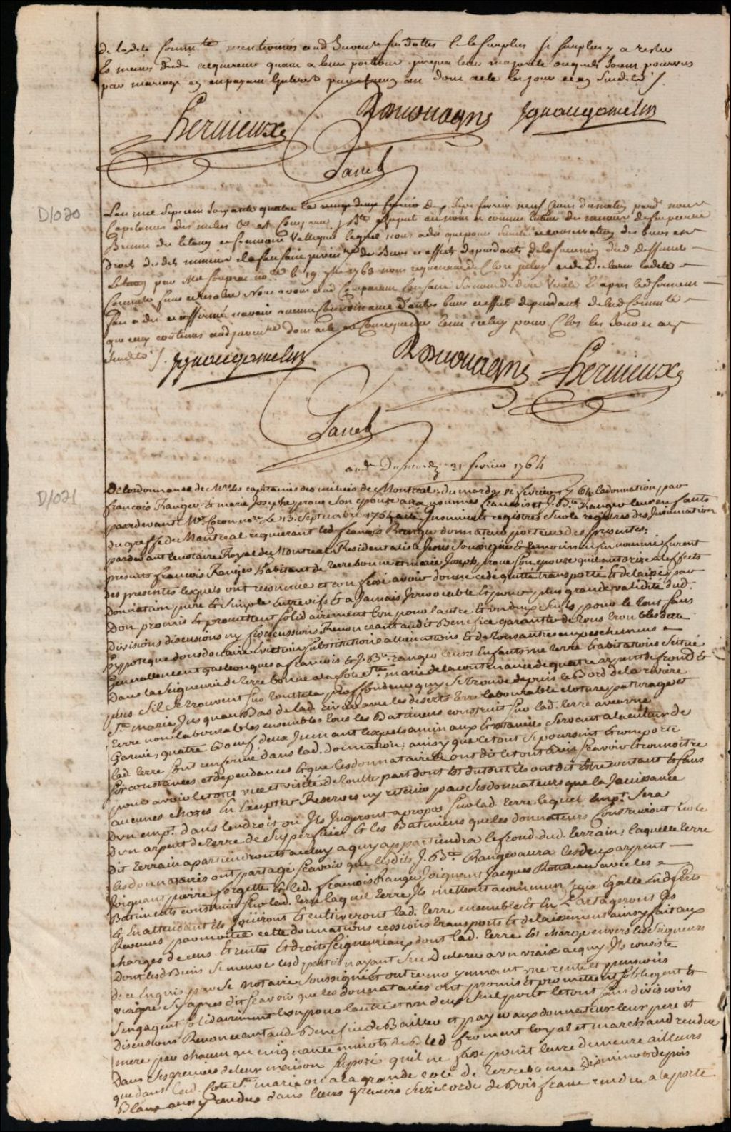 Insinuation de la donation consentie par François Ranger et Marie Josèphe Proulx, son épouse, à leurs enfants François Ranger et Jean Baptiste Ranger, 21 février 1764, Archives nationales à Montréal, Fonds Cour supérieure. District judiciaire de Montréal. Procédures en matières non contentieuses, (06M,CP601,S4,SS1,D1021).