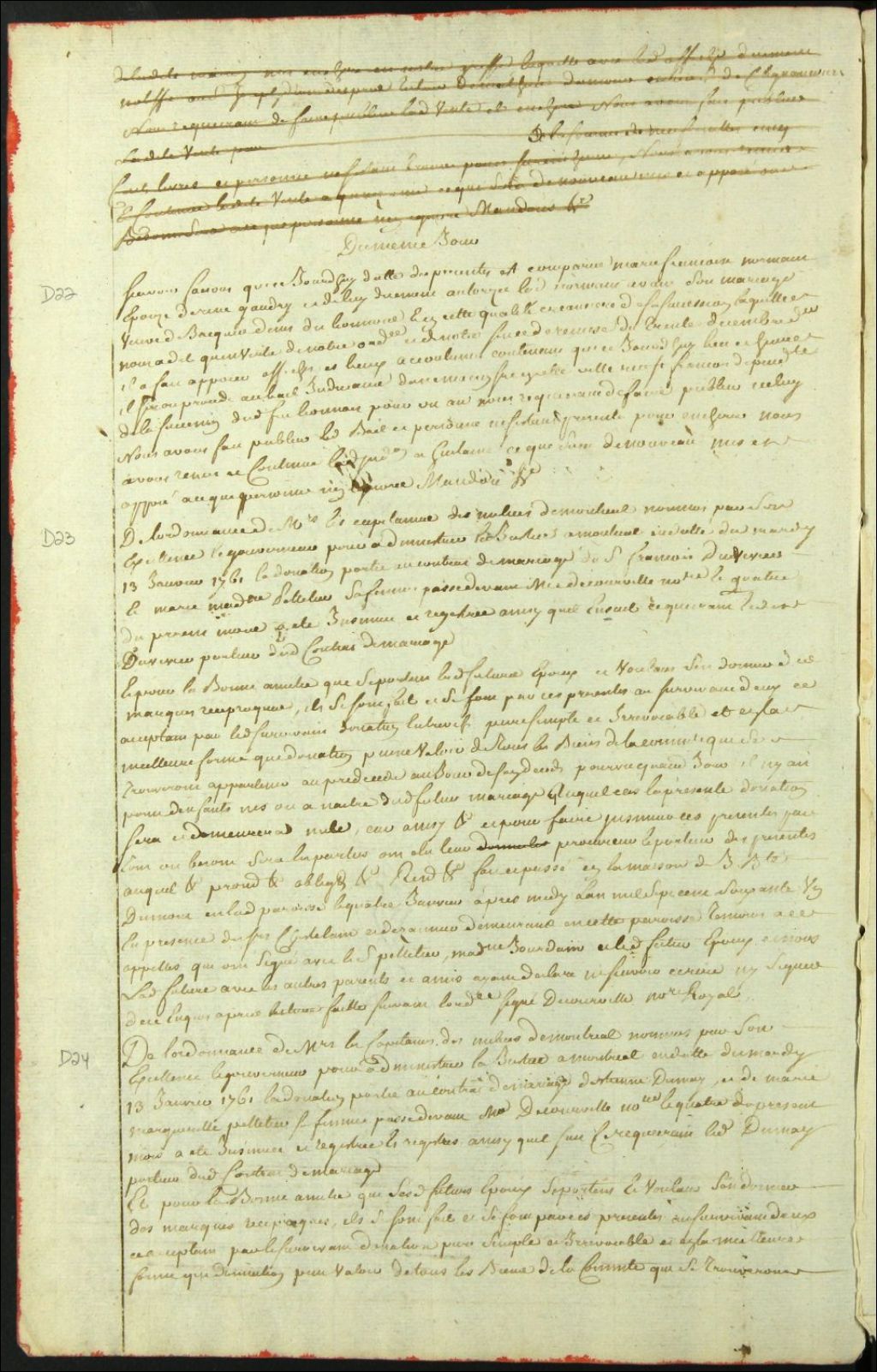Insinuation de la donation portée au contrat de mariage entre Étienne Dumay [Étienne Dumais] et Marie Marguerite Pelletier, 13 janvier 1761, Archives nationales à Montréal, Fonds Cour supérieure. District judiciaire de Montréal. Procédures en matières non contentieuses, (06M,CP601,S4,SS1,D24).