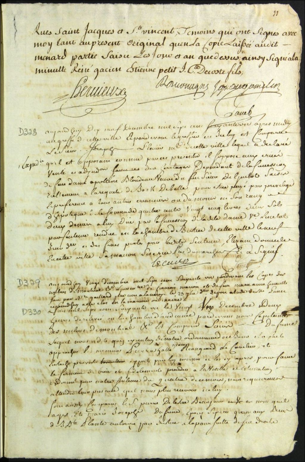 Assermentation des experts de Louis Dufresne, Pierre Delestre Beaujour et Marie Josèphe Dufresne, épouse séparée quant aux biens de Jean Baptiste Plante, pour la visite et estimation des biens dépendants de la succession des défunts Luc Dufresne et [Marie Josèphe Jetté Durivage], 21 décembre 1761, Archives nationales à Montréal, Fonds Cour supérieure. District judiciaire de Montréal. Procédures en matières non contentieuses, (06M,CP601,S4,SS1,D330).