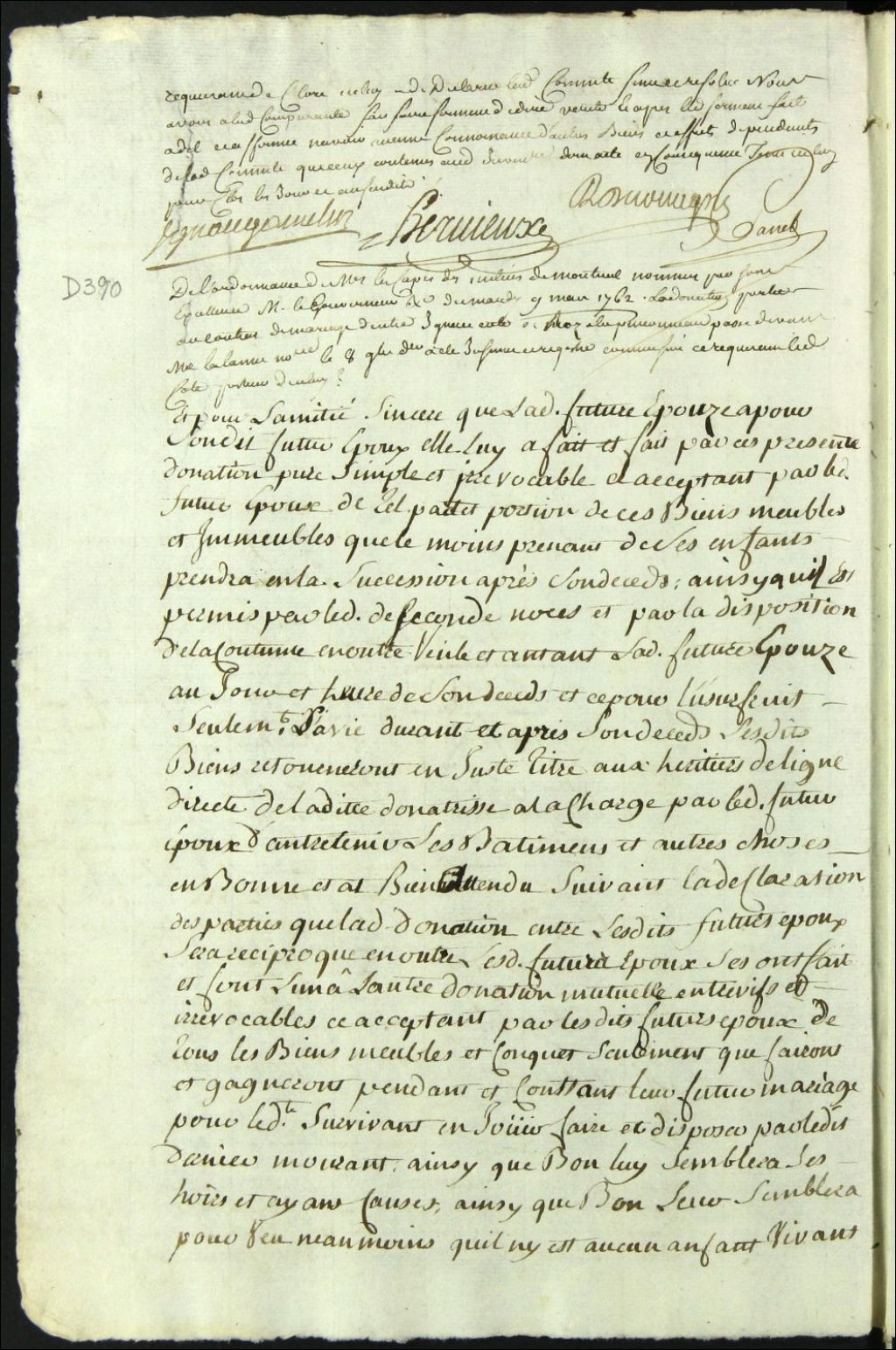 Insinuation de la donation portée au contrat de mariage entre Ignace Côté et Rosalie Pinsonneault, 9 mars 1762, Archives nationales à Montréal, Fonds Cour supérieure. District judiciaire de Montréal. Procédures en matières non contentieuses, (06M,CP601,S4,SS1,D390).