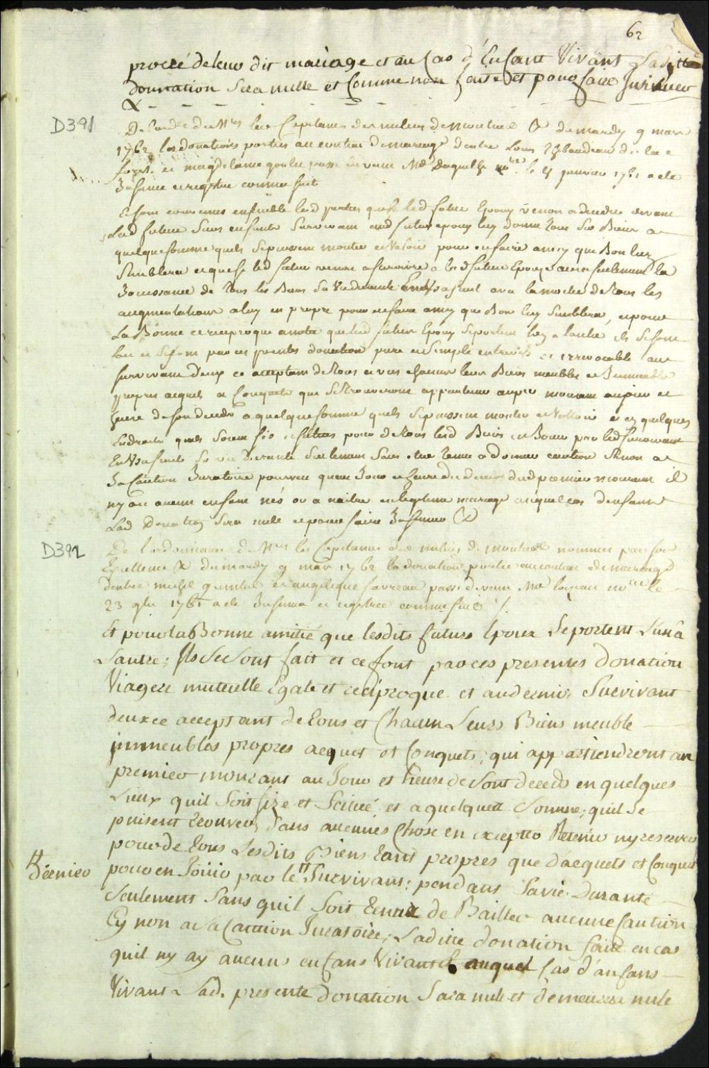 Insinuation de la donation portée au contrat de mariage entre Michel Quintal et Angélique Favreau, 9 mars 1762, Archives nationales à Montréal, Fonds Cour supérieure. District judiciaire de Montréal. Procédures en matières non contentieuses, (06M,CP601,S4,SS1,D392).