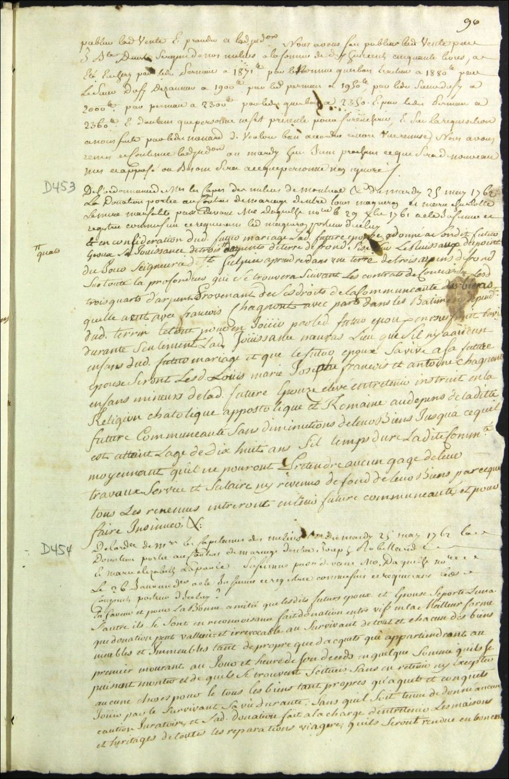Insinuation de la donation portée au contrat de mariage entre Joseph Robillard et Marie Josèphe Laporte, 25 mai 1762, Archives nationales à Montréal, Fonds Cour supérieure. District judiciaire de Montréal. Procédures en matières non contentieuses, (06M,CP601,S4,SS1,D454).