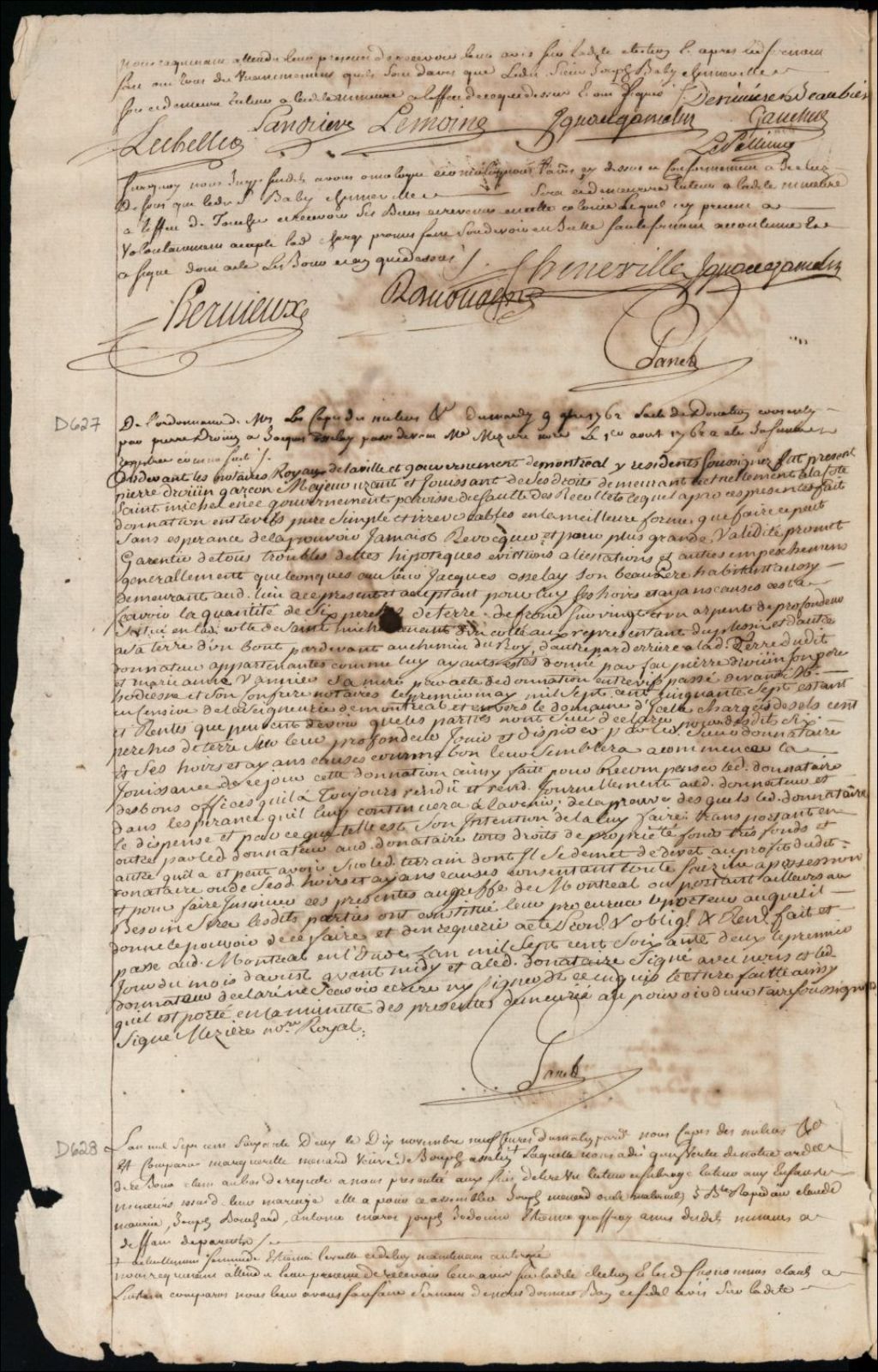Insinuation de la donation consentie par Pierre Drouin à Jacques Osselay [Jacques Osselet Montmidi Montminy] son beau-père, 9 novembre 1762, Archives nationales à Montréal, Fonds Cour supérieure. District judiciaire de Montréal. Procédures en matières non contentieuses, (06M,CP601,S4,SS1,D627).