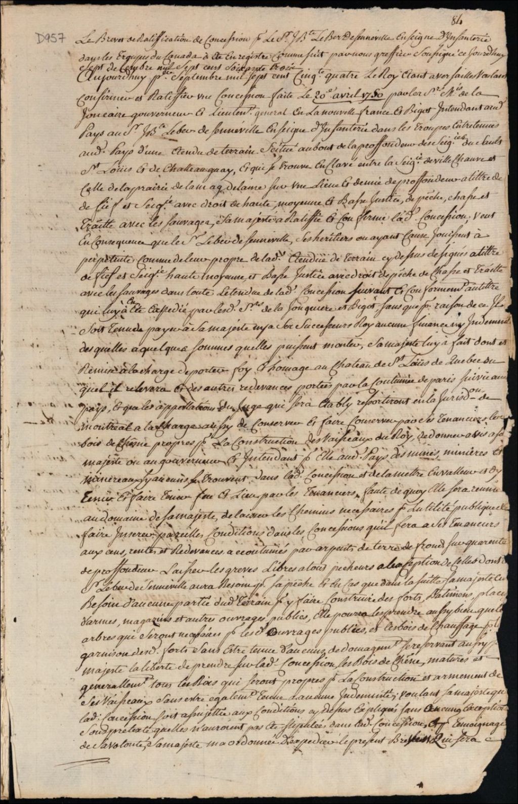 Homologation du brevet de ratification d'une concession de terres à Jean Baptiste Leber Senneville, 7 décembre 1763, Archives nationales à Montréal, Fonds Cour supérieure. District judiciaire de Montréal. Procédures en matières non contentieuses, (06M,CP601,S4,SS1,D957).