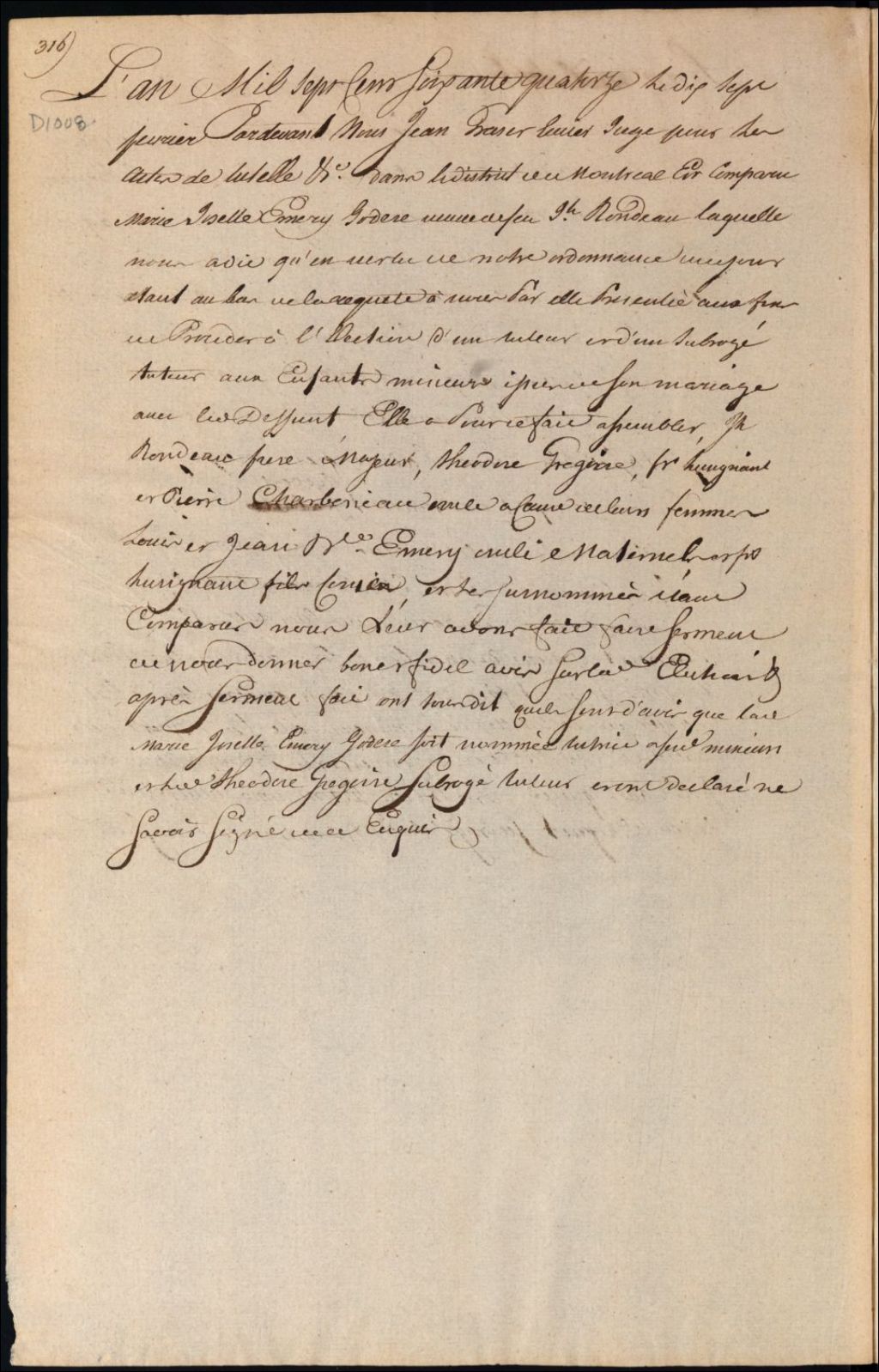 Tutelle des enfants mineurs de feu Joseph Rondeau et de Marie Josèphe Émery Coderre, 17 février 1774, Archives nationales à Montréal, Fonds Cour supérieure. District judiciaire de Montréal. Procédures en matières non contentieuses, (06M,CP601,S5,D1008).