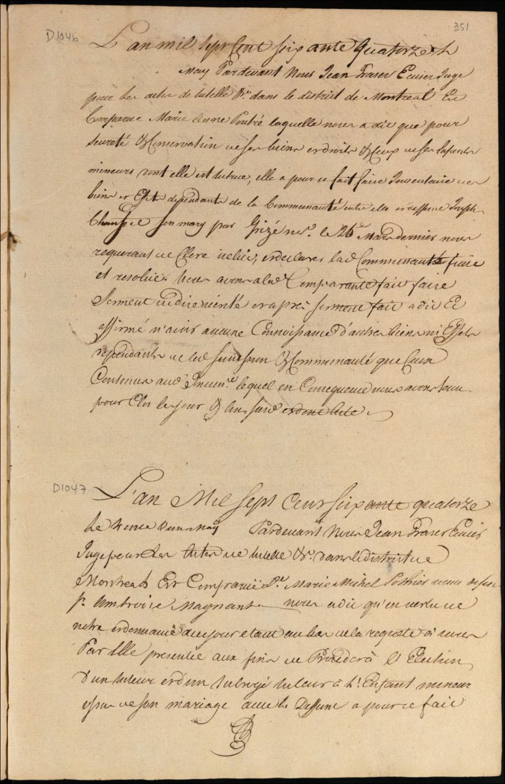 Clôture d'inventaire des biens de la succession et de la communauté de feu Joseph Chauset [Joseph Sozet Matelot Simence ] et Marie Anne Poutré [Marie Anne Poudrette Lavigne], Mai 1774, Archives nationales à Montréal, Fonds Cour supérieure. District judiciaire de Montréal. Procédures en matières non contentieuses, (06M,CP601,S5,D1046).