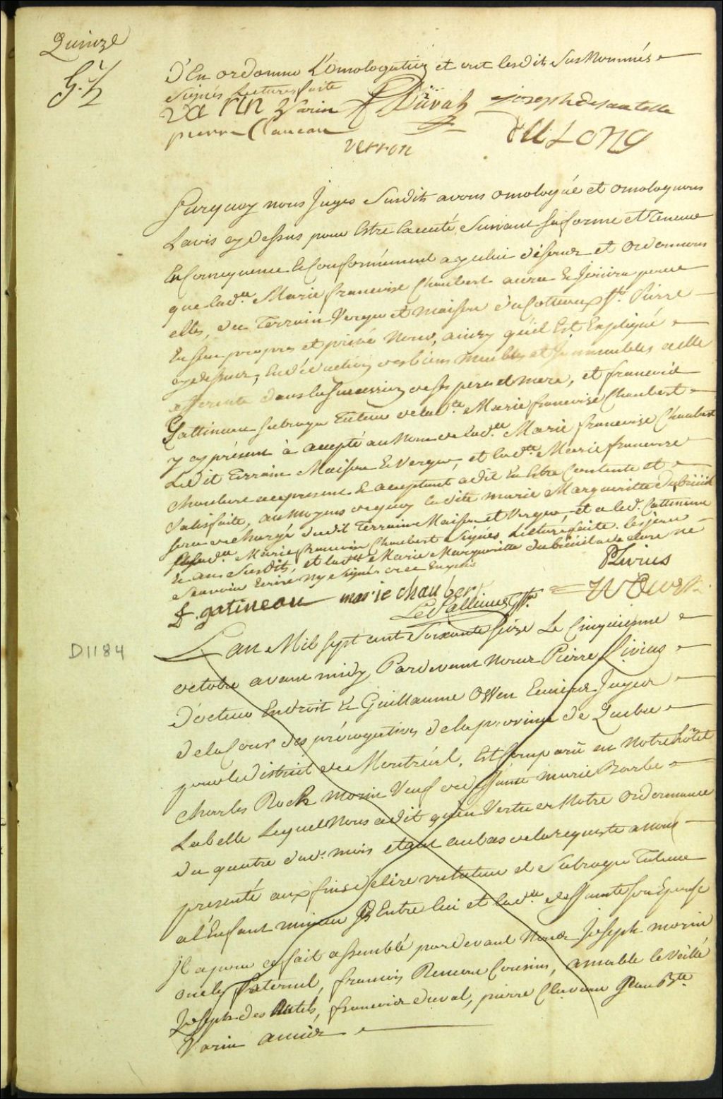 Tutelle de l'enfant mineur de feu Marie Barbe Labelle et de Charles Roch Morin, 5 octobre 1776, Archives nationales à Montréal, Fonds Cour supérieure. District judiciaire de Montréal. Procédures en matières non contentieuses, (06M,CP601,S5,D1184).