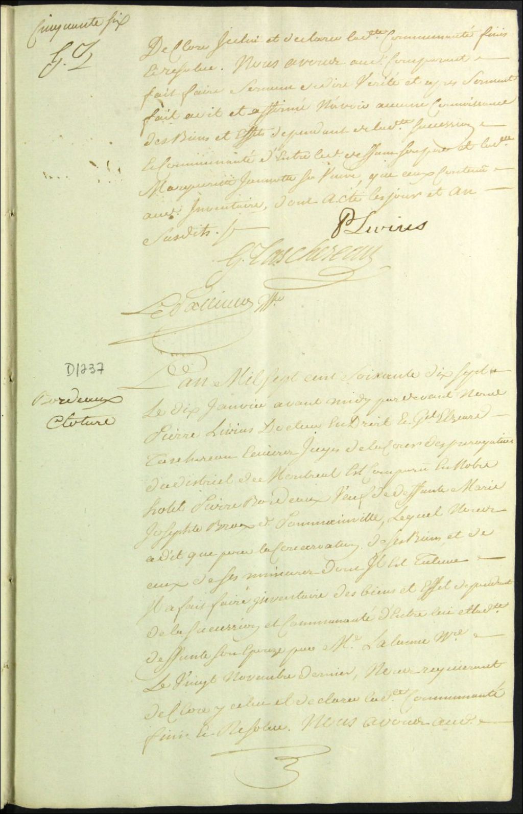 Clôture d'inventaire des biens de la succession et de la communauté de feu Marie Josèphe Barault Pominville et Pierre Bourdeau, 10 janvier 1777, Archives nationales à Montréal, Fonds Cour supérieure. District judiciaire de Montréal. Procédures en matières non contentieuses, (06M,CP601,S5,D1237).