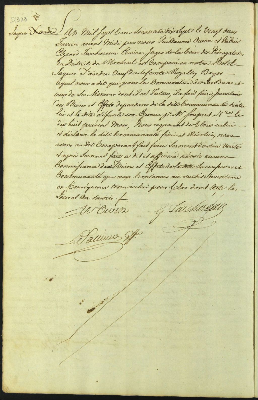 Clôture d'inventaire des biens de la succession et de la communauté de feu Rosalie Boyer et Jacques Xandre, 22 février 1777, Archives nationales à Montréal, Fonds Cour supérieure. District judiciaire de Montréal. Procédures en matières non contentieuses, (06M,CP601,S5,D1323).