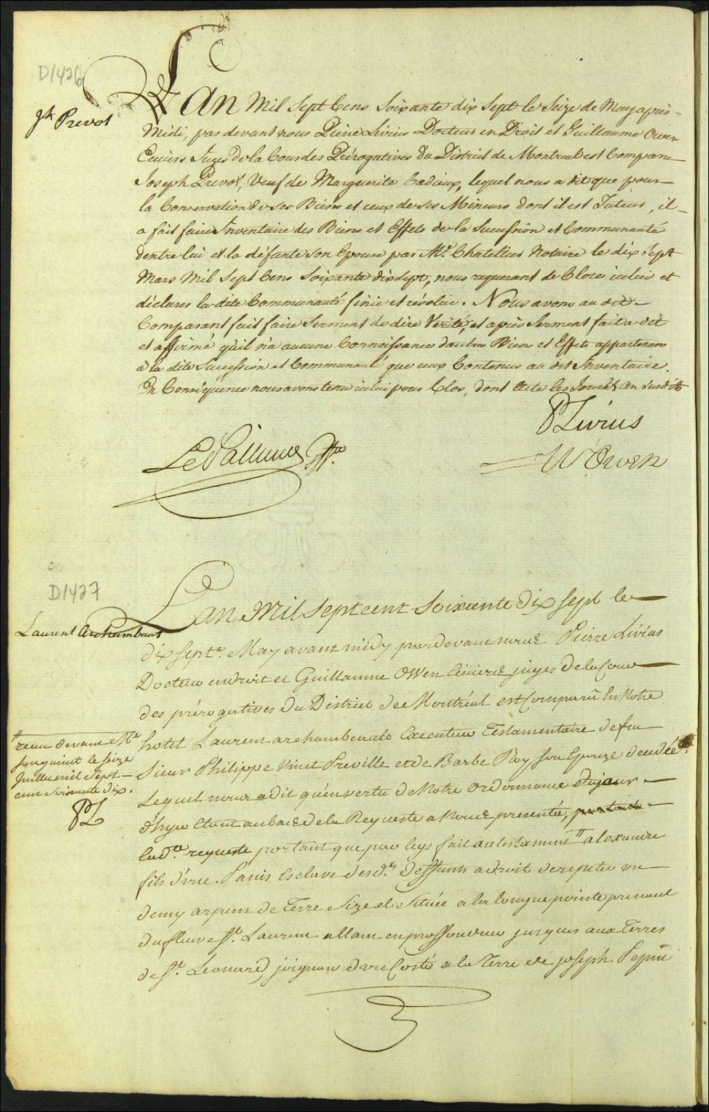 Tutelle d'Alexandre, enfant minueur d'une Panis esclave des défunts Philippe Vinet Préville et Barbe Roy, son épouse - Élection et administration tutélaires, 17 mai 1777, Archives nationales à Montréal, Fonds Cour supérieure. District judiciaire de Montréal. Procédures en matières non contentieuses, (06M,CP601,S5,D1427).