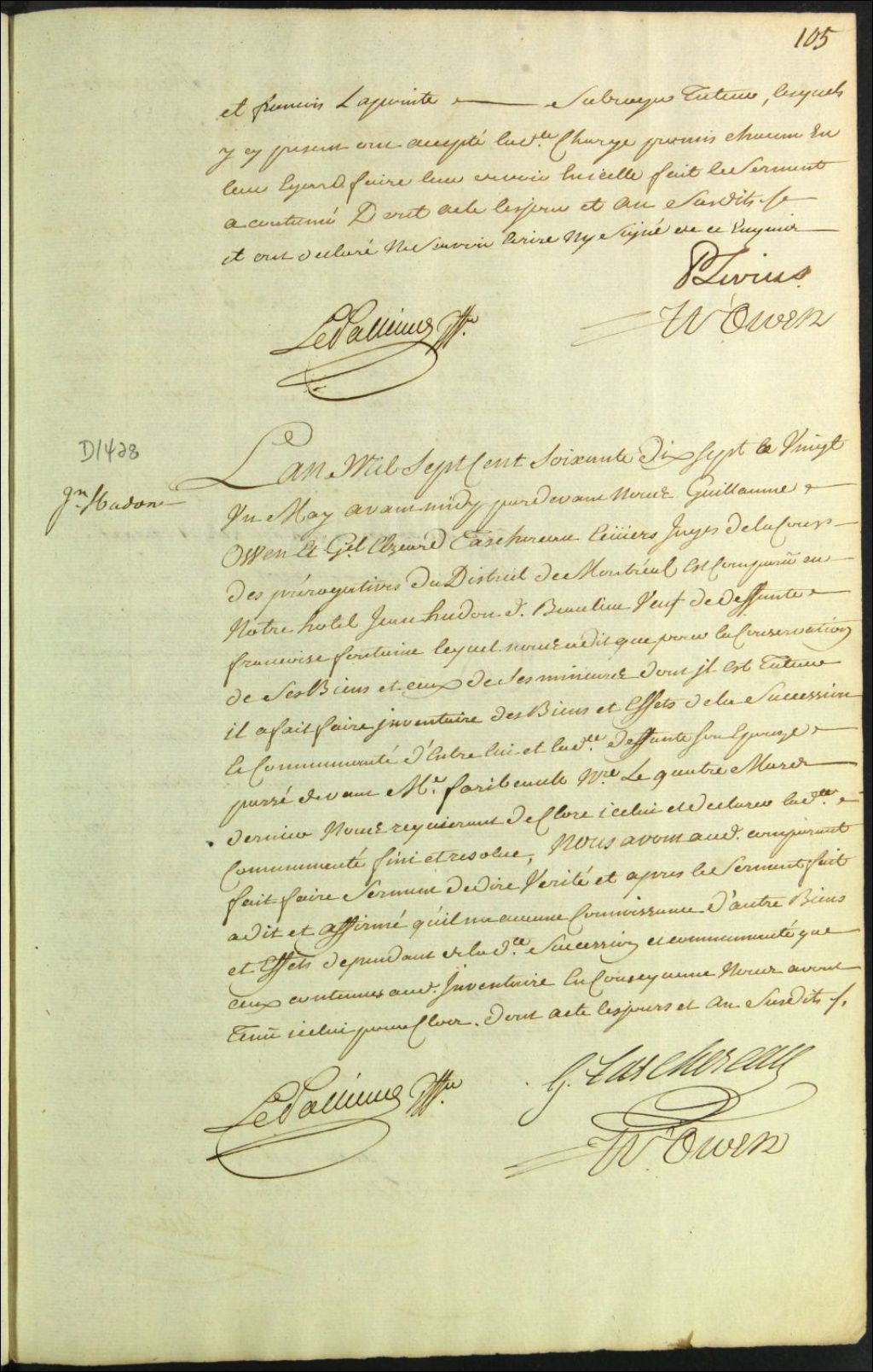 Clôture d'inventaire des biens de la succession et de la communauté de feu Françoise Fontaine et Jean Hudon Beaulieu [François Hudon Beaulieu ?], 21 mai 1777, Archives nationales à Montréal, Fonds Cour supérieure. District judiciaire de Montréal. Procédures en matières non contentieuses, (06M,CP601,S5,D1428).