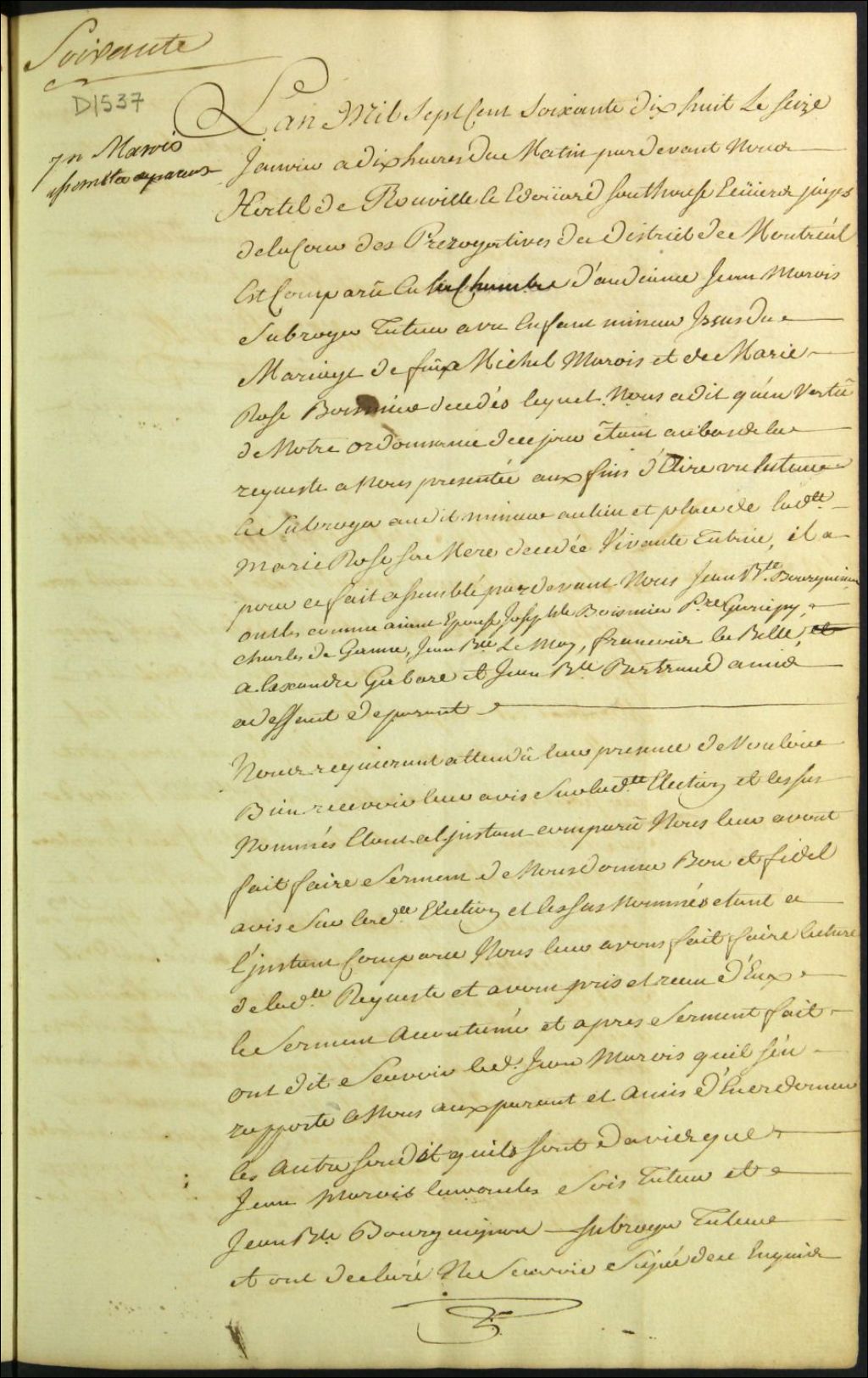 Tutelle de l'enfant mineur des défunts Michel Marois et Marie Rose Boismière [Marie Rose Beaumier Boisme], 16 janvier 1778, Archives nationales à Montréal, Fonds Cour supérieure. District judiciaire de Montréal. Procédures en matières non contentieuses, (06M,CP601,S5,D1537).