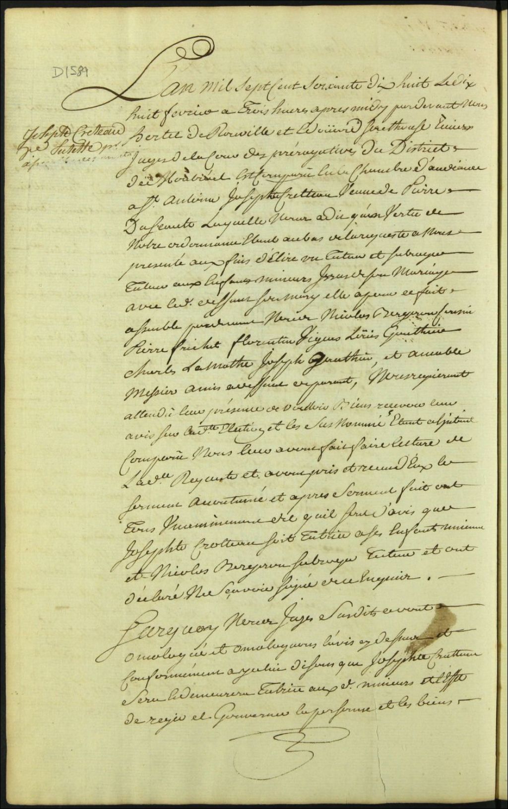 Tutelle des enfants mineurs de feu Pierre Dusseault et de Josèphe Croteau, 18 février 1778, Archives nationales à Montréal, Fonds Cour supérieure. District judiciaire de Montréal. Procédures en matières non contentieuses, (06M,CP601,S5,D1589).