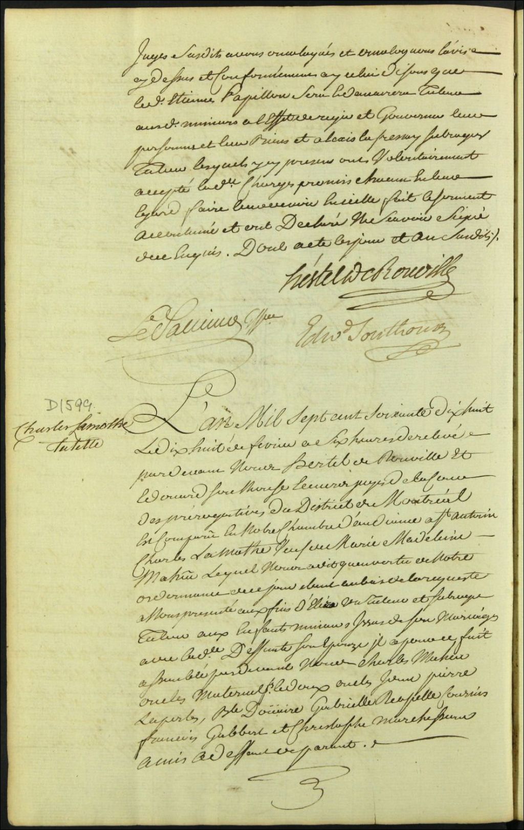 Tutelle des enfants mineurs de feu Marie Madeleine Maheu et de Charles Lamothe, 18 février 1778, Archives nationales à Montréal, Fonds Cour supérieure. District judiciaire de Montréal. Procédures en matières non contentieuses, (06M,CP601,S5,D1599).
