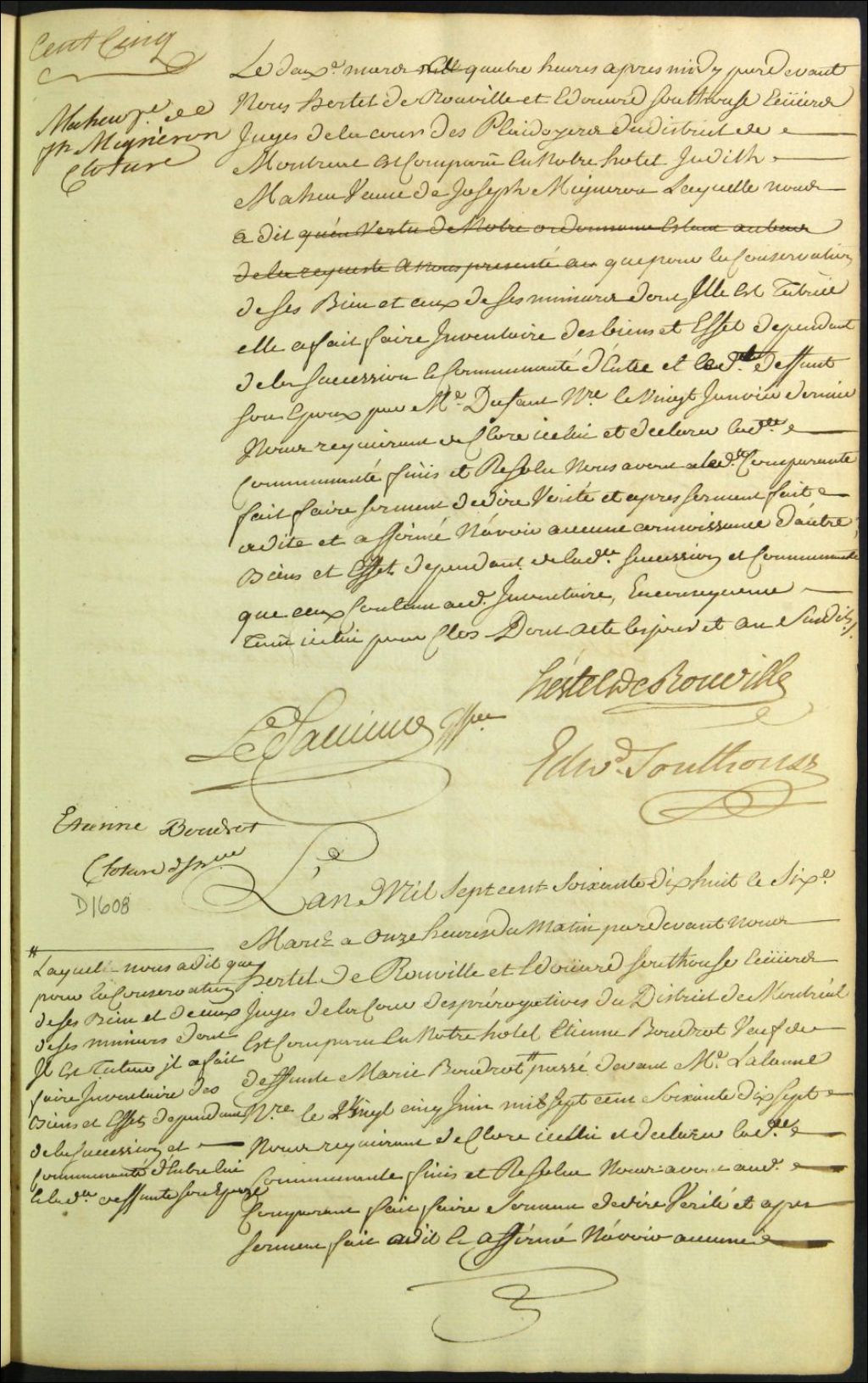 Clôture d'inventaire des biens de la succession et de la communauté de feu Marie Boudreau et d'Étienne Boudreau, 6 mars 1778, Archives nationales à Montréal, Fonds Cour supérieure. District judiciaire de Montréal. Procédures en matières non contentieuses, (06M,CP601,S5,D1608).