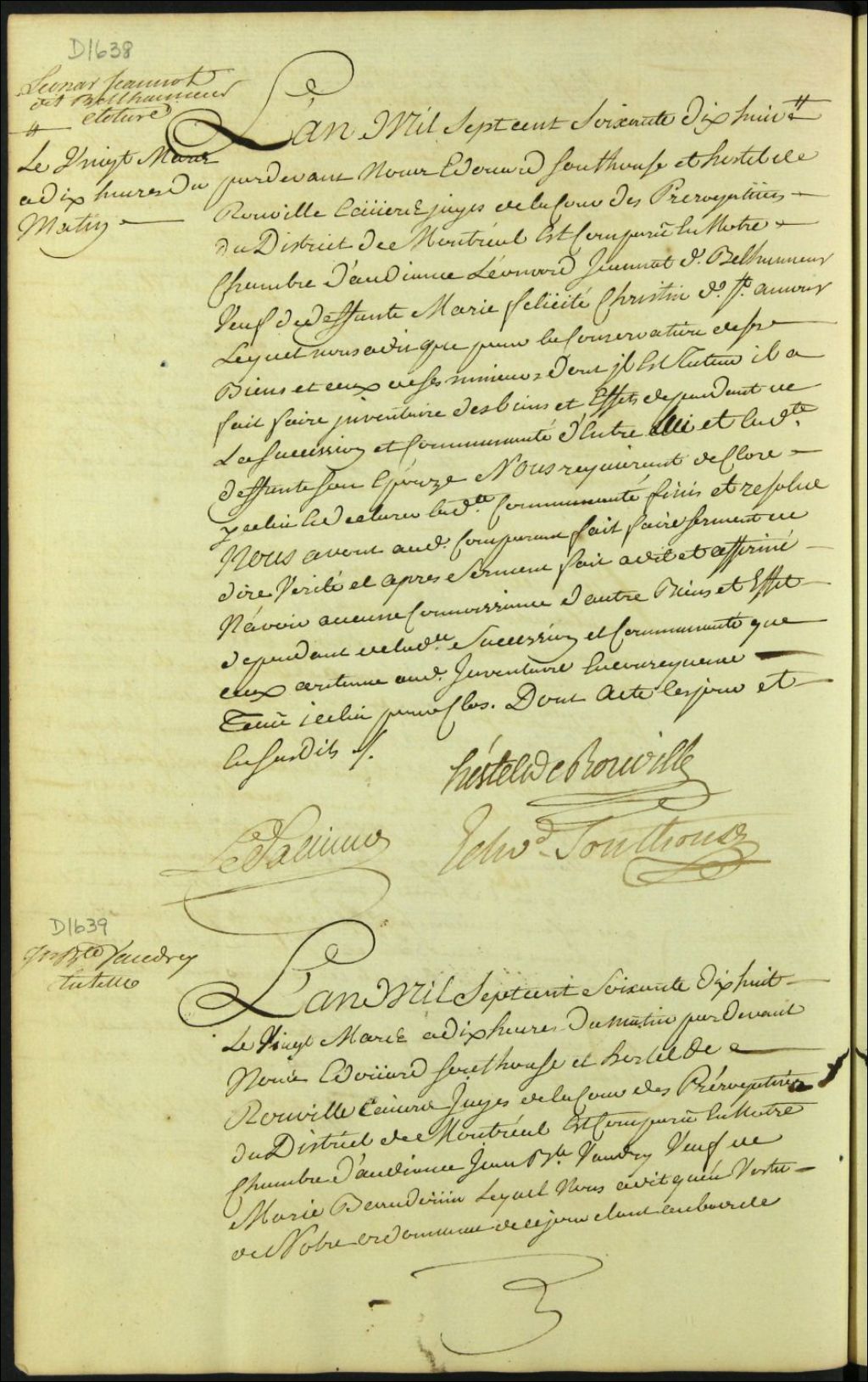 Tutelle de l'enfant mineur de feu Marie Baudouin et de Jean Baptiste Vaudry, 20 mars 1778, Archives nationales à Montréal, Fonds Cour supérieure. District judiciaire de Montréal. Procédures en matières non contentieuses, (06M,CP601,S5,D1639).
